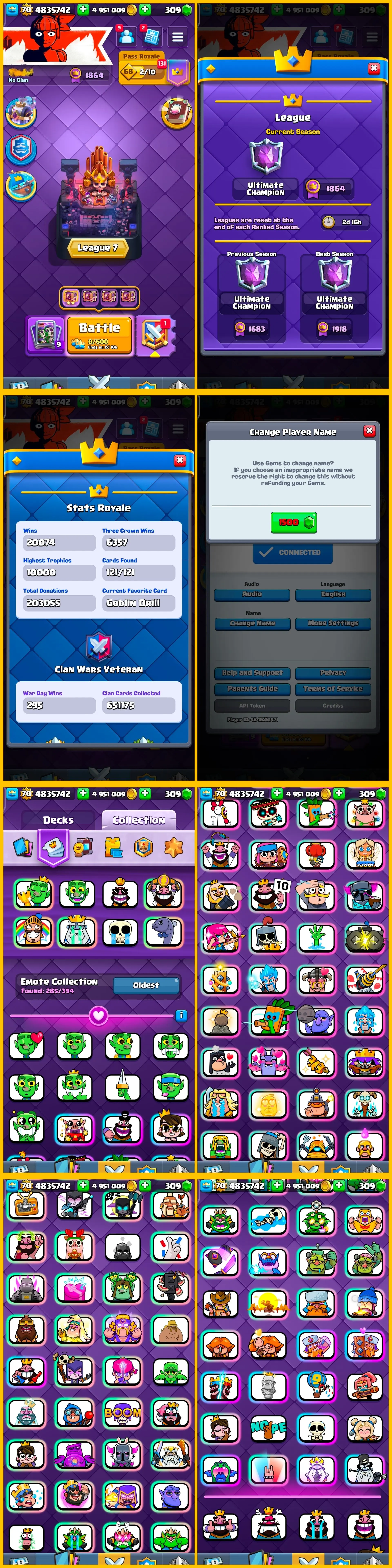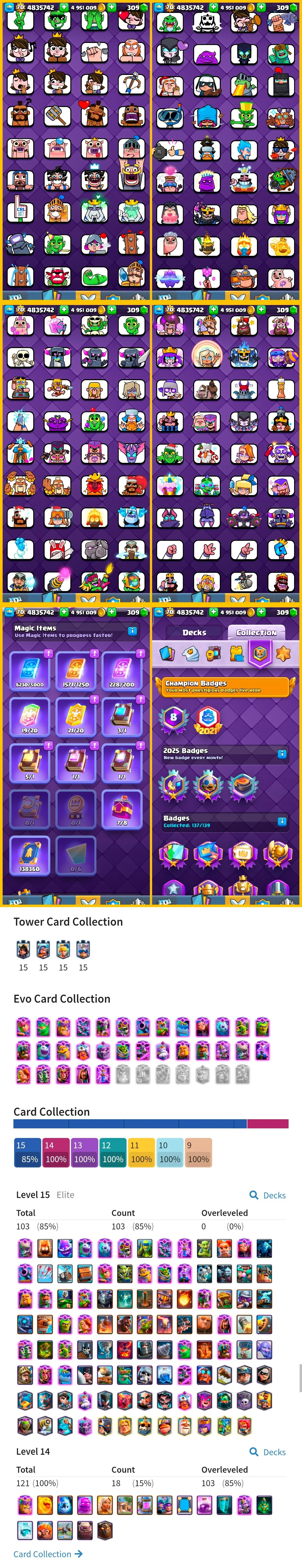 [KT 15 ~ Level 70] ALL 121 Cards Max, 103 Cards Level 15 + 18 Level 14 | 31 Evos Unlock, 285 Nice Emotes | 60+ Tower Skins, 275 Banners & 281 Frames
