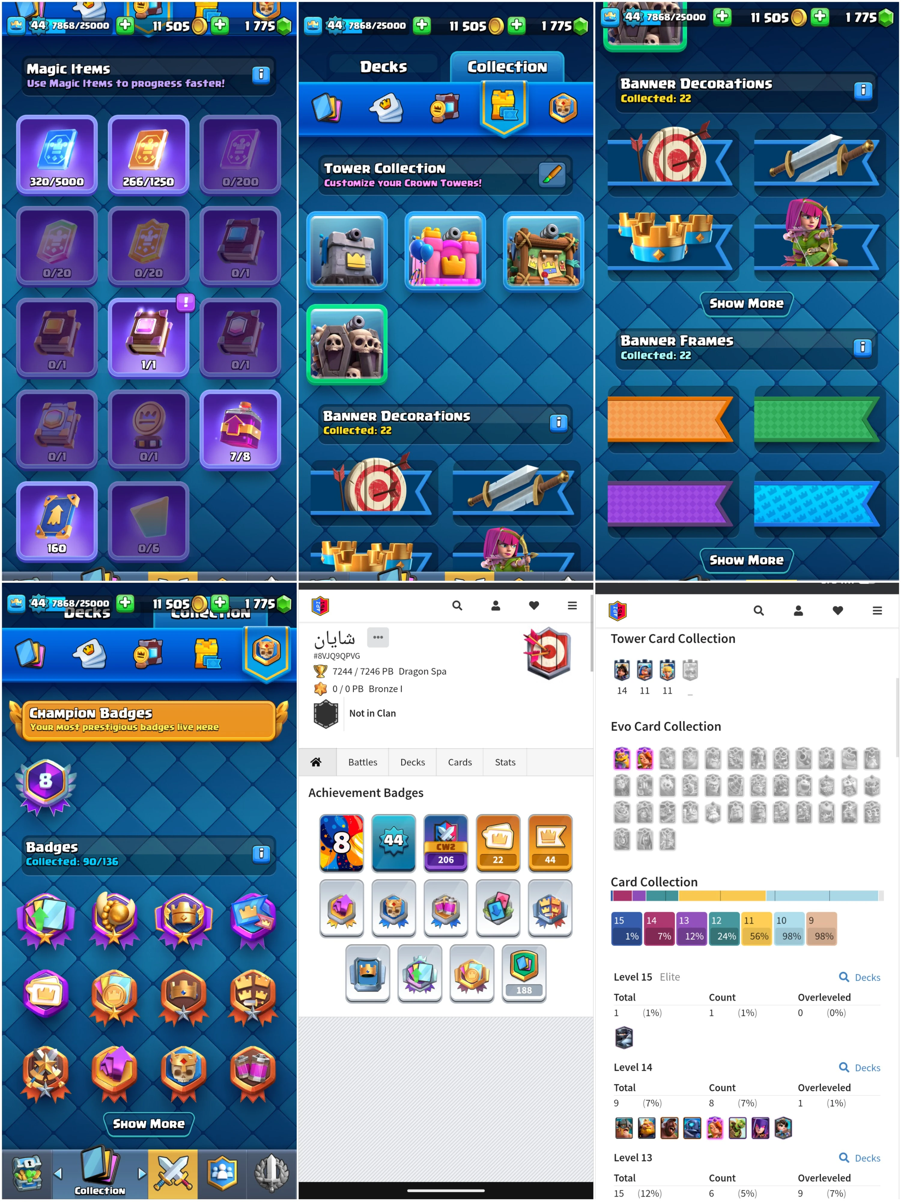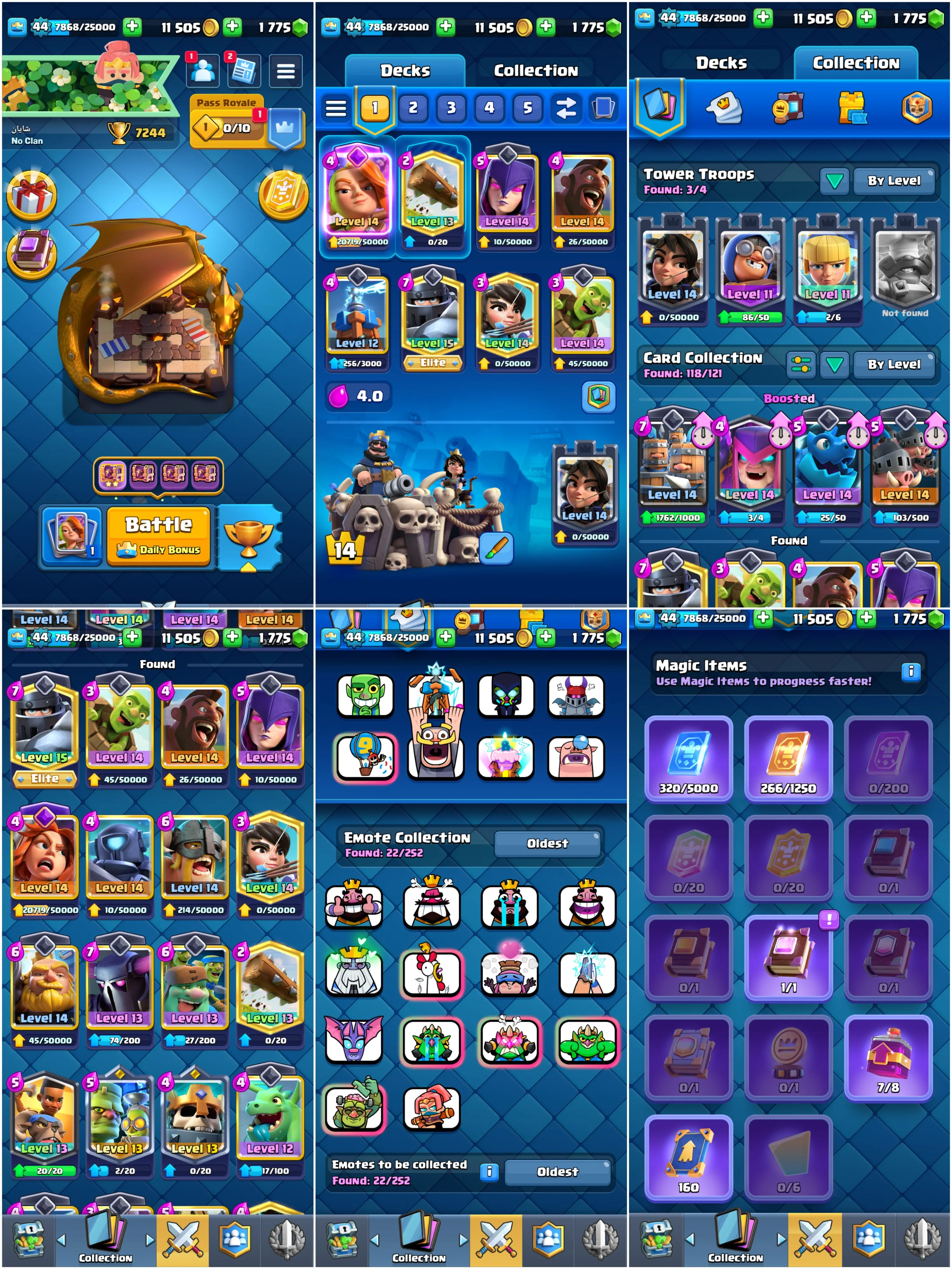 🎖️ Rarest 8 Years Played Badge 🌟 Level 44 💎 KT 14 💫 1700+ Gems ⚔️ 9 Max Cards 🎯 1 Elite 🎭 22 Emotes 🎨 4 Tower Skins 🚀 Instant Delivery