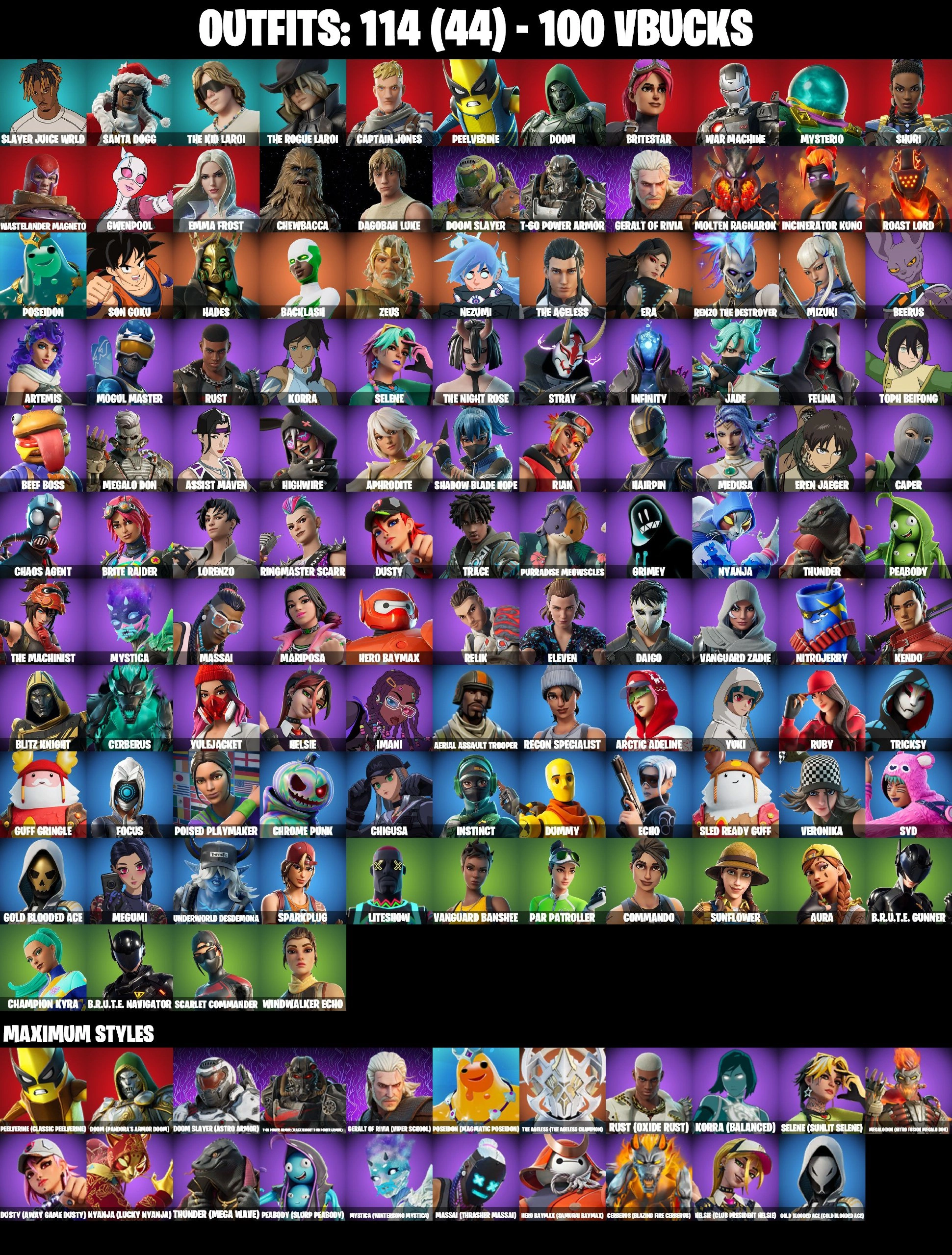 ❤️ 114 SKINS ❤️ BACKLASH ❤️ CHEWBACCA ❤️ DAGOBAH LUKE ❤️ GET GRIDDY ❤️ STAR WAND ❤️ SON GOKU ❤️ BEERUS ❤️ EREN JAEGER ❤️ TOPH ❤️ DUMMY ❤️ MYSTICA MAX ❤️ HELSIE MAX ❤️ ARTEMIS ❤️ MARIPOSA ❤️ AURA ❤️ PAR PATROLLER