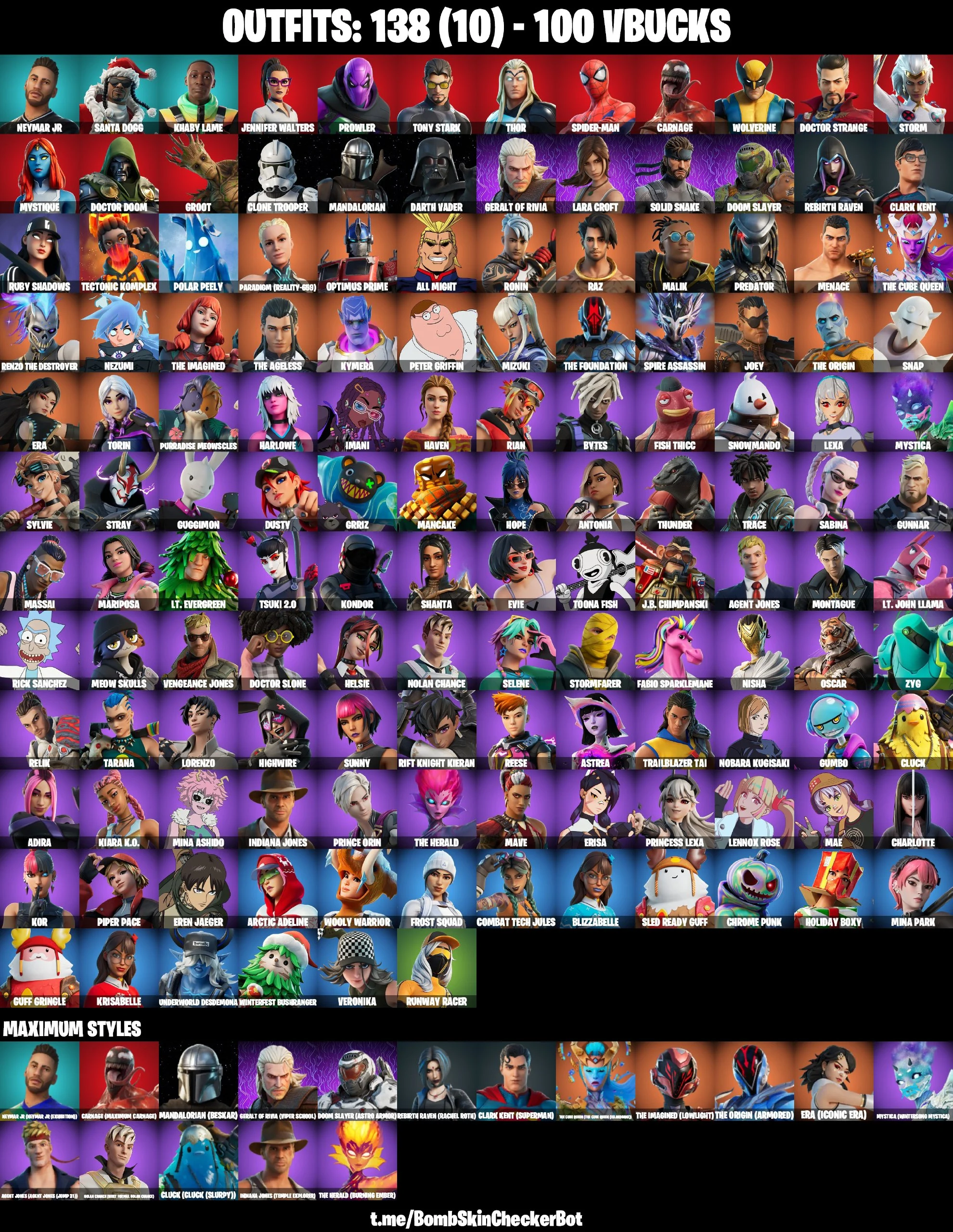 🔮138 Skins🔮 Rage💎Rushin Around💎All Might💎Tony Stark💎Darth Vader💎Lara Croft💎Neymar Jr💎Erisa💎Astrea💎Veronika💎Clark Kent💎Polar Peely💎Blizzabelle💎Krisabelle💎Doctor Strange