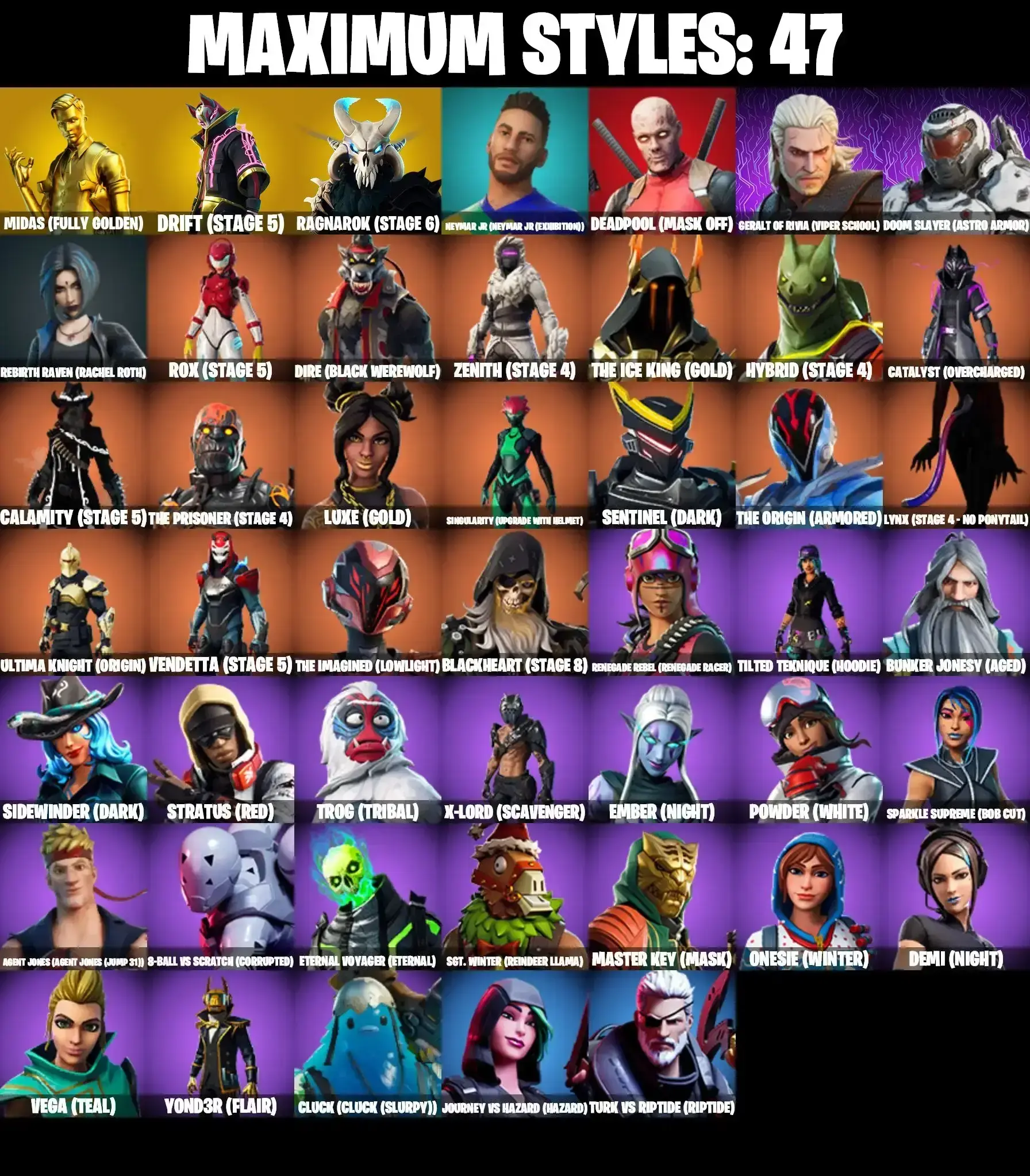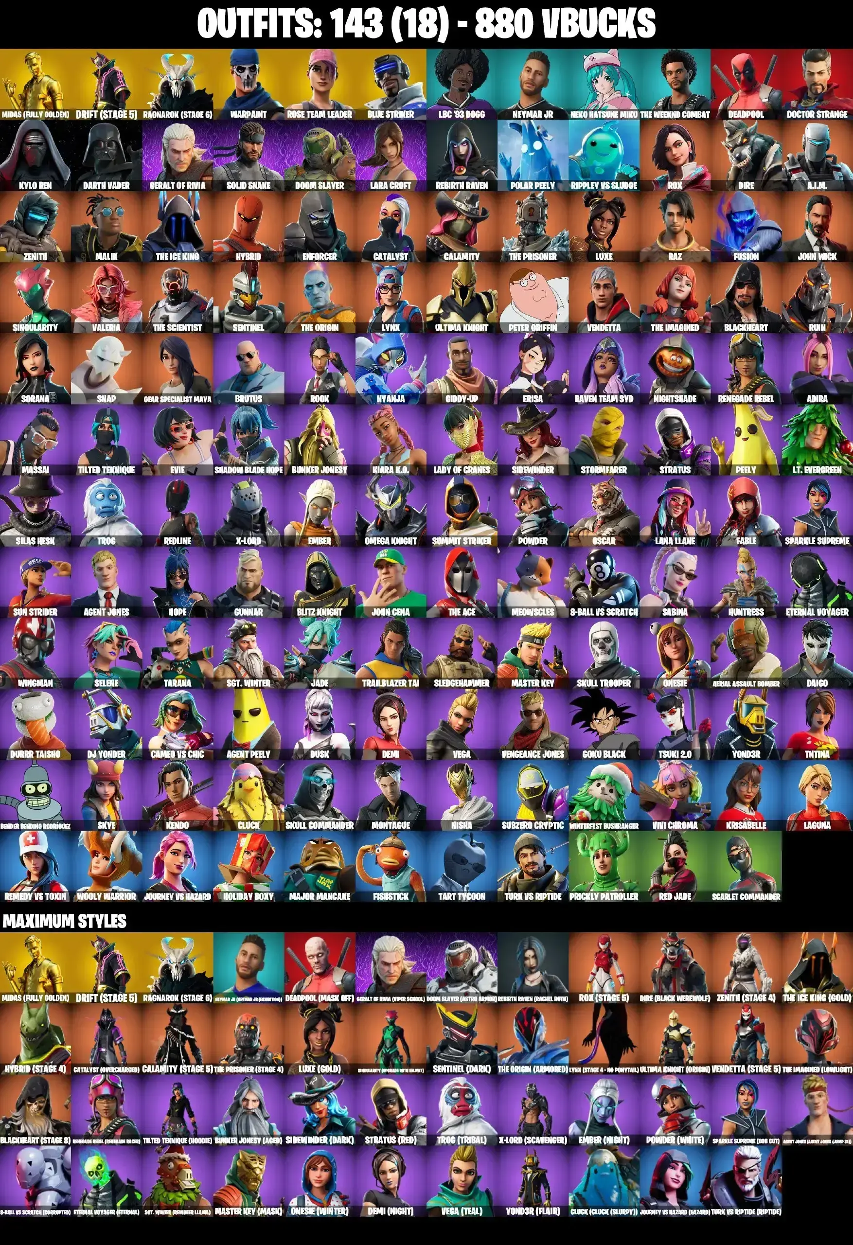 143 SKINS | OG STW FOUNDERS | RACHEL ROTH | SKULL TROOPER | LARA CROFT | JABBA SWITCHWAY | KYLO REN | DARTH VADER | GOLDEN MIDAS | ORANGE JUSTICE | LAUGH IT UP | JOHN CENA | GOKU BLACK | CATALYST MAX | ONESIE MAX | ROOK | EVIE | L