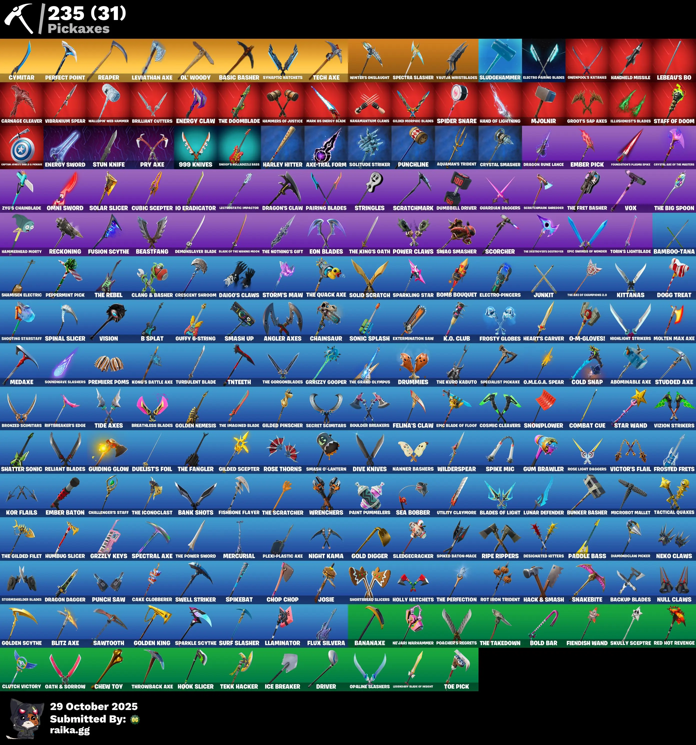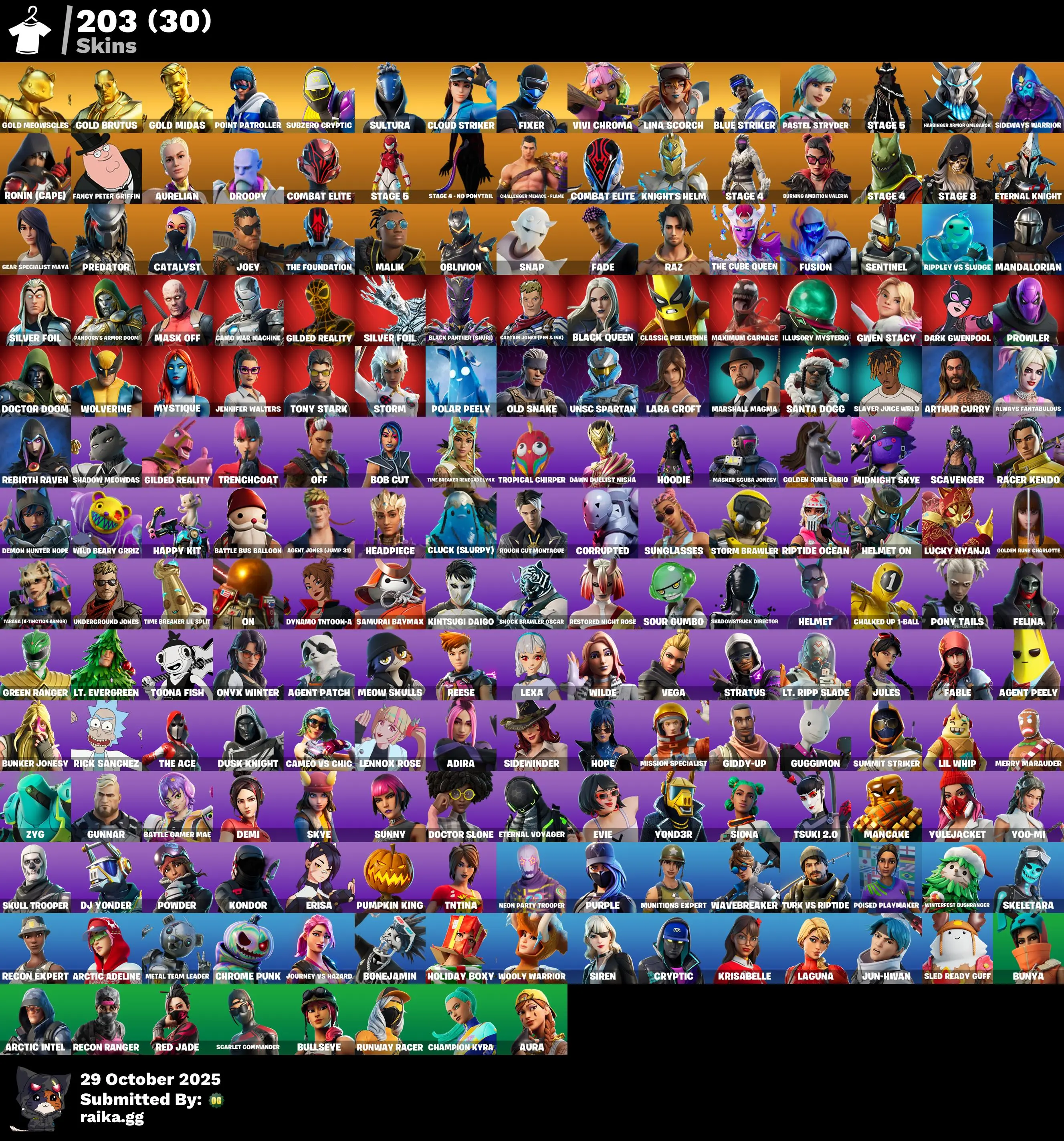 203 skins | Gold Midas🎃Lara Croft🎃Harley Quinn🎃Spider-Gwen🎃Spider-Man🎃Take The Elf🎃Merry Marauder🎃Jules🎃Tilted Teknique🎃The Origin🎃Agent Jones🎃Lynx🎃Siona🎃Fabio Sparklemane🎃Vega🎃The Kuro Kabuto🎃B Splat🎃Yoo-mi🎃Storm D5272
