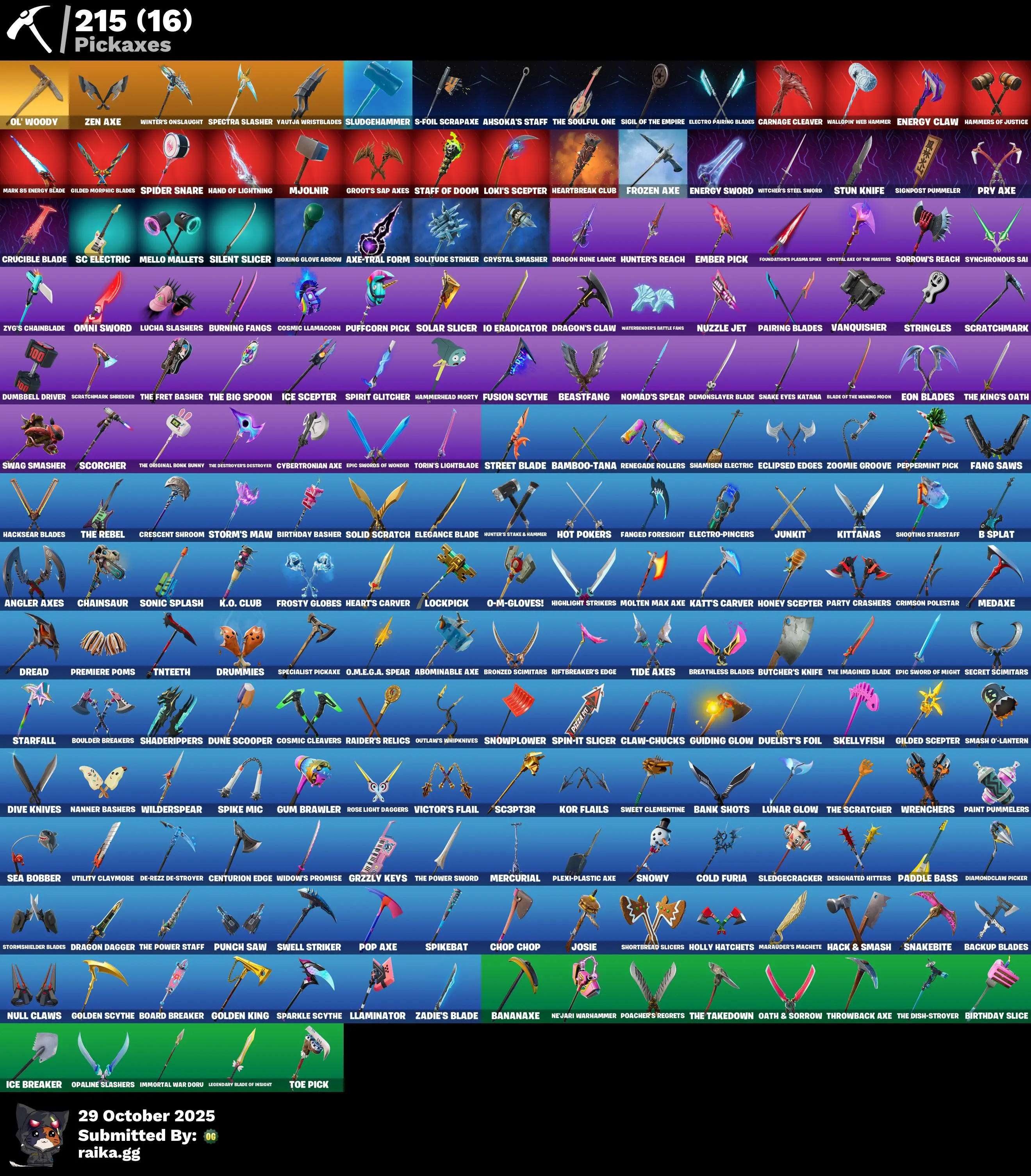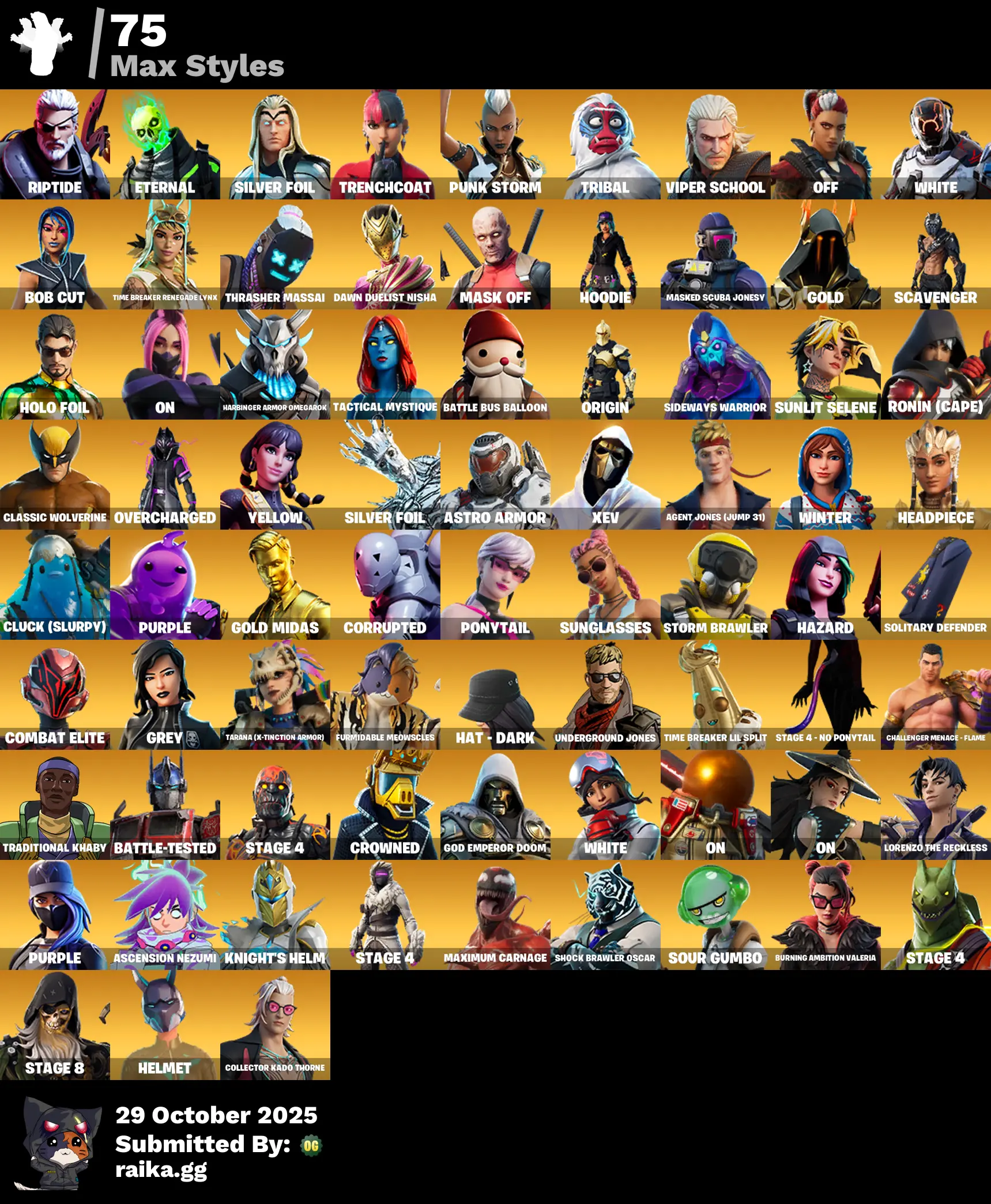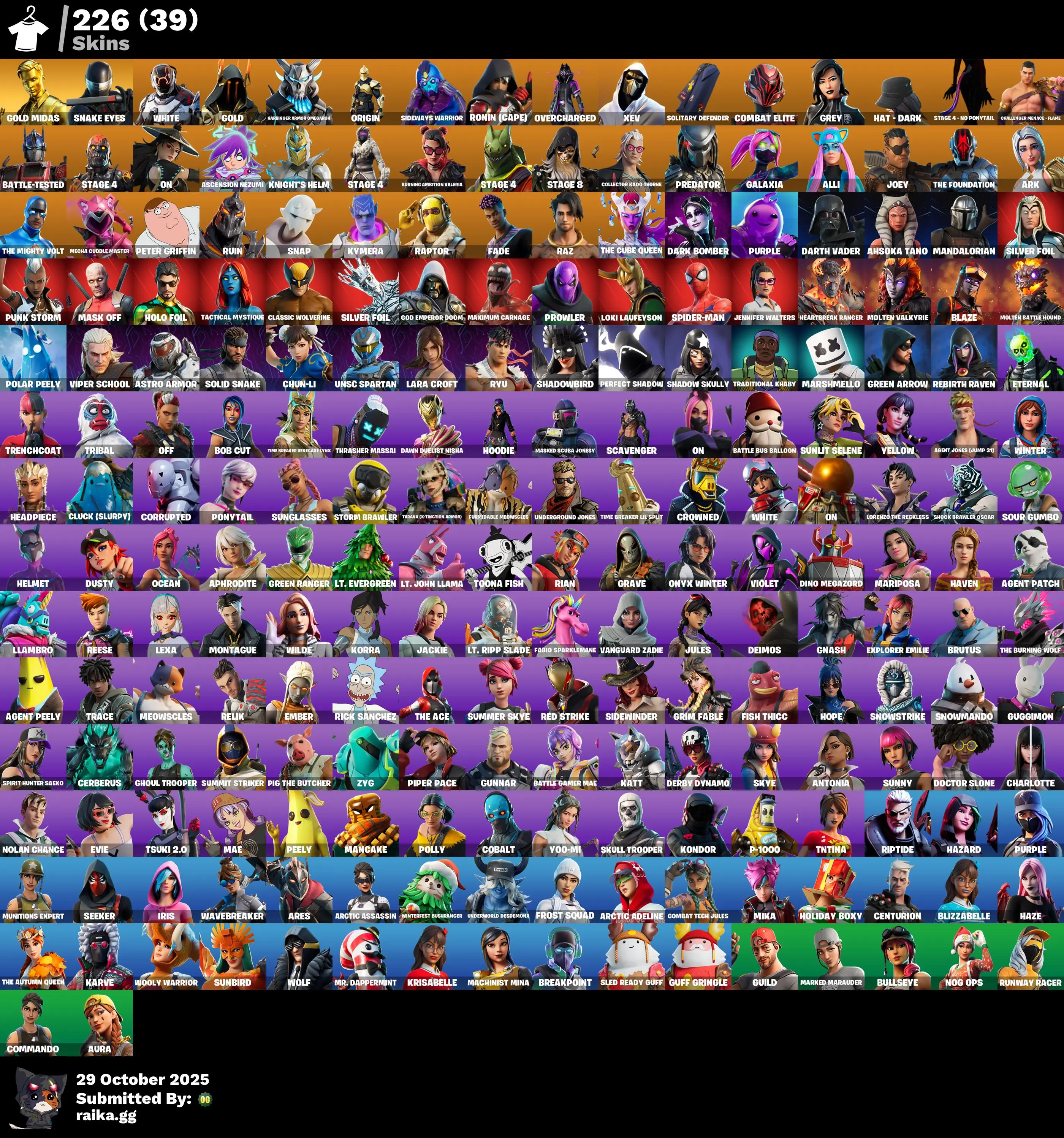 226 skins | Chun-Li🎃Laugh It Up🎃Gold Midas🎃Get Griddy🎃Take The Elf🎃Lara Croft🎃Spider-Man🎃Go Mufasa🎃Jules🎃Combat Tech Jules🎃Cinder🎃Staff of Doom🎃X-Lord🎃Kymera🎃Blackheart🎃Cerberus🎃Ocean🎃De-Rezz De-stroyer🎃Gumbo🎃Lt. Ripp Slade D5264