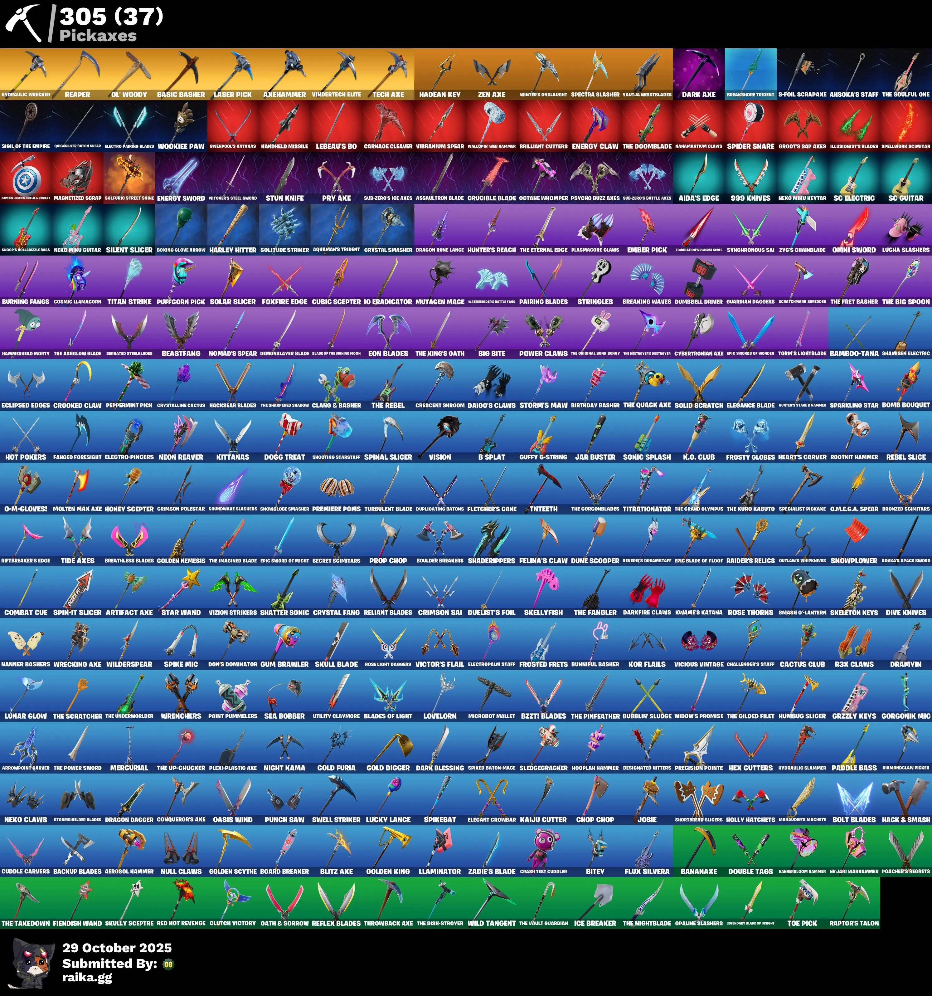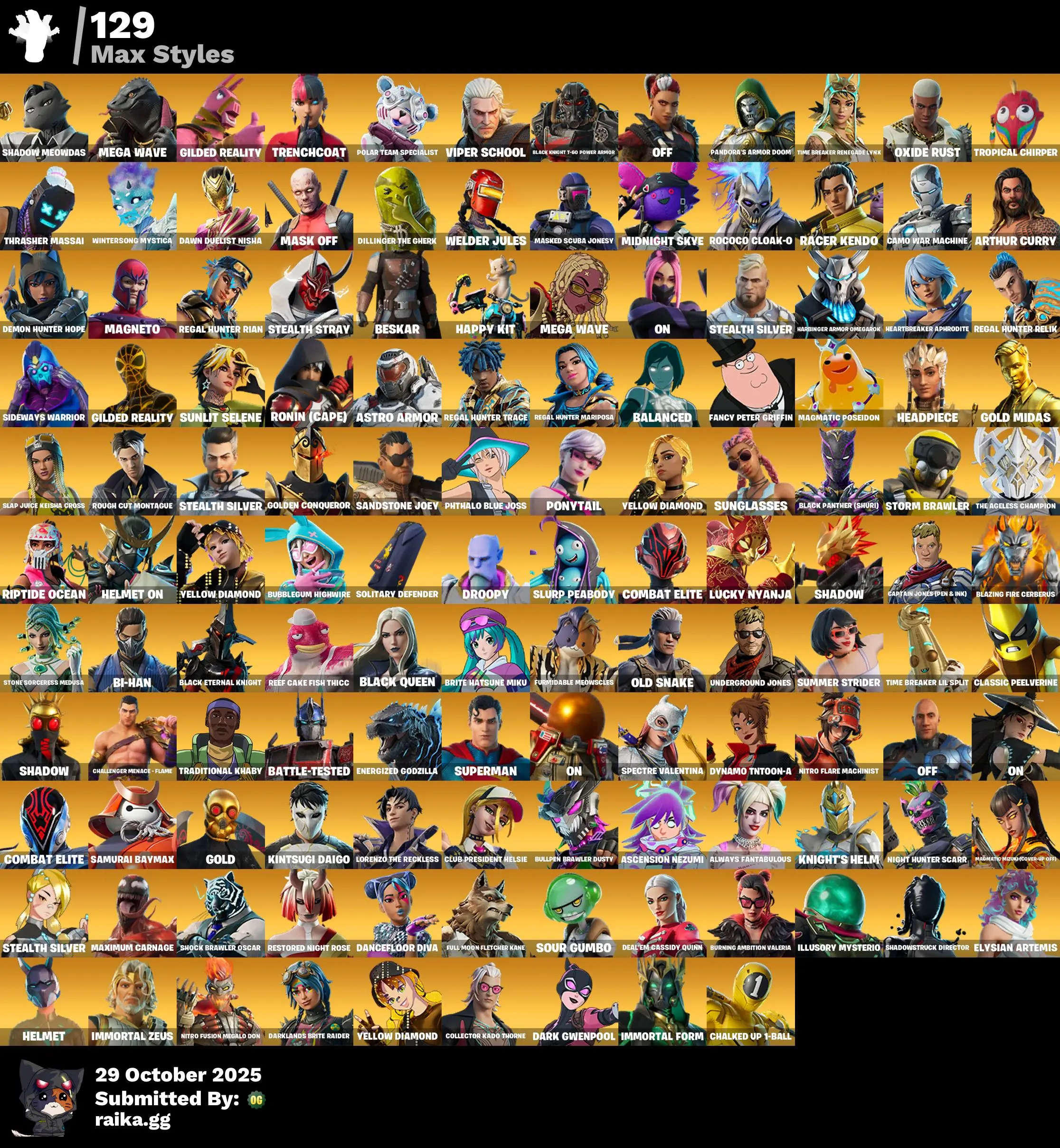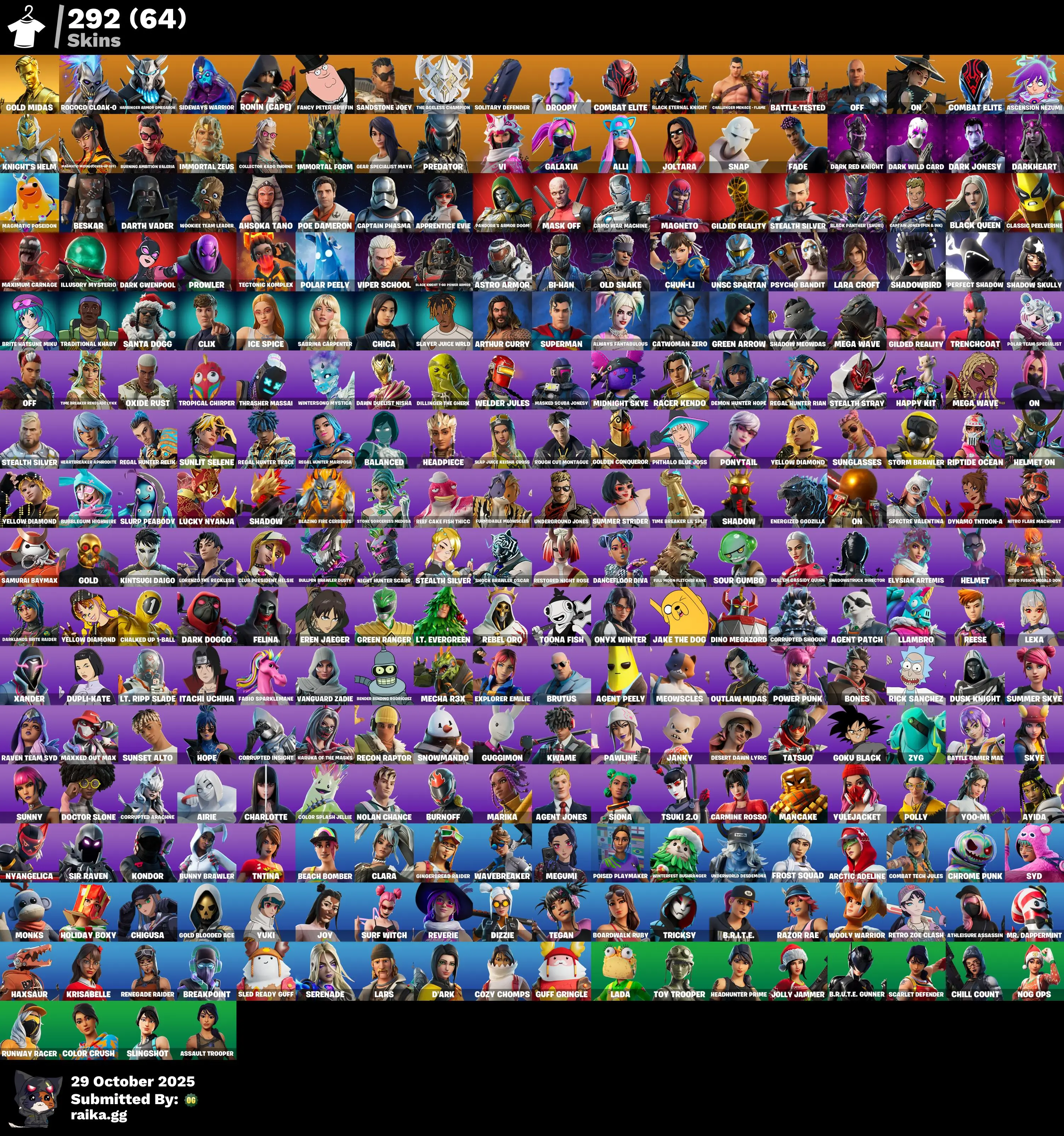 292 skins | Chun-Li🎃Psycho Bandit🎃Eren Jaeger🎃Itachi Uchiha🎃Gold Midas🎃Spider-Man🎃Lara Croft🎃Harley Quinn🎃Jules🎃Combat Tech Jules🎃Spiked Baton-Mace🎃Jubi Slide🎃SC Guitar🎃Cozy Chomps🎃Tatsuo🎃Bones🎃Bunny Brawler D5263