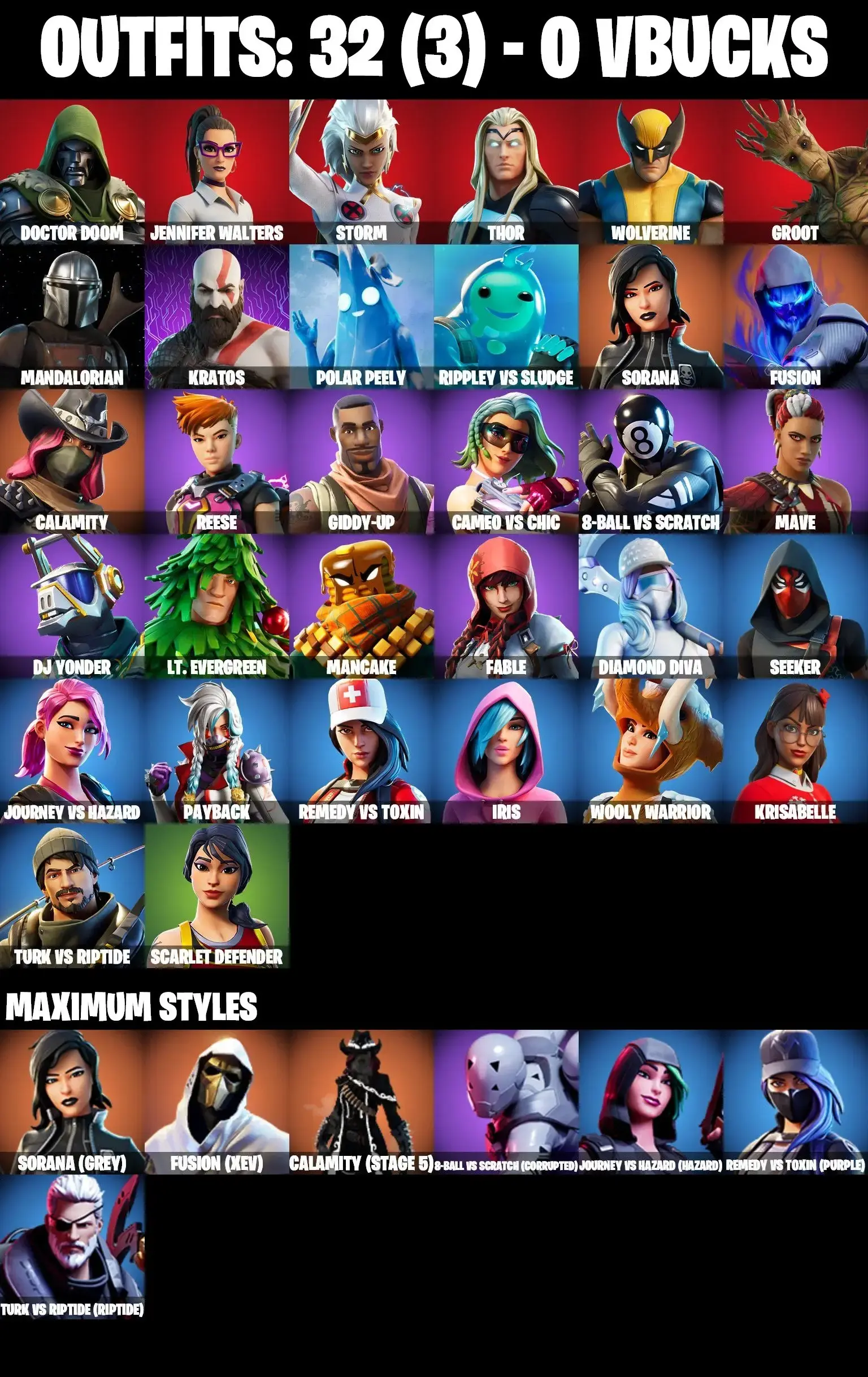 32 SKINS | LEVIATHAN AXE | KRATOS | MANDALORIAN | FUSION MAX | 8-BALL MAX | WOLVERINE | MYSTIQUE | SCARLET DEFENDER | PEPPERMINT PICK | CAN PLAY ON PSN,XBOX,PC,NINTENDO,MOBILE | 0 VBUCKS | FULL EMAIL ACCESS