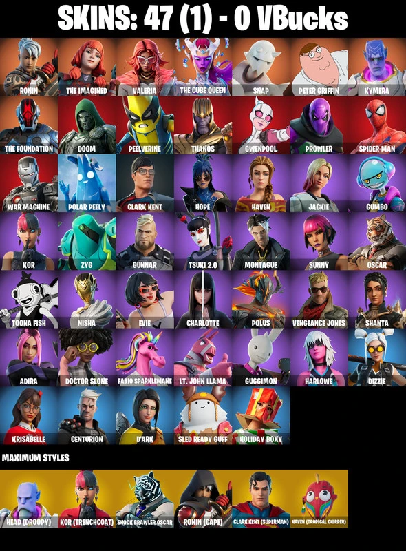 47 SKINS 🔥 Hope | Kor | Ronin | The Imagined | Valeria | The Cube Queen | Snap | Peter Griffin | Kymera | The Foundation | Doom | Peelverine | Thanos | Gwenpool | Prowler | Spider-Man | War Machine | Polar Peely | Clark Kent