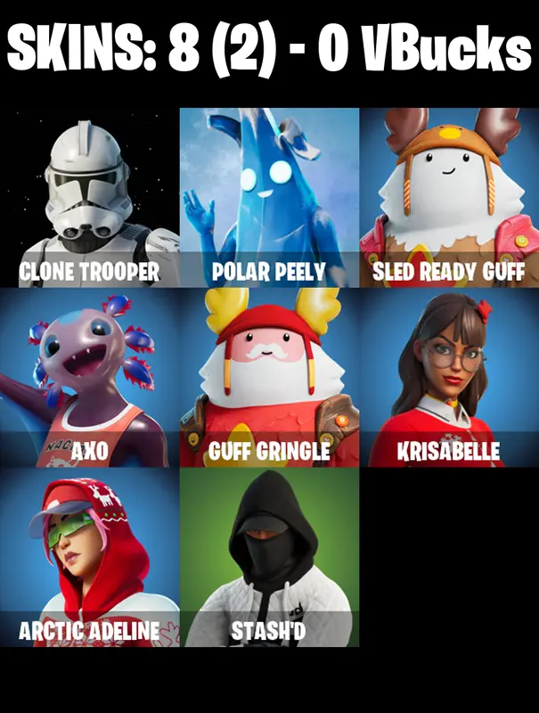 8 SKINS 🔥 Clone Trooper | Polar Peely | Sled Ready Guff | Axo | Guff Gringle | Krisabelle | Arctic Adeline | Stash'd | Tekk Pack | Clawz Retro | Nemesis Box | Republic Army Backpack | Gwenpool's Katanas | Adira's Battle Flag