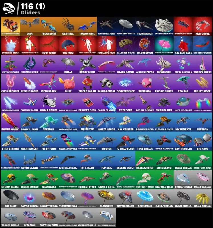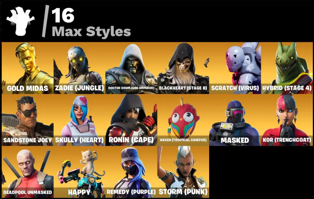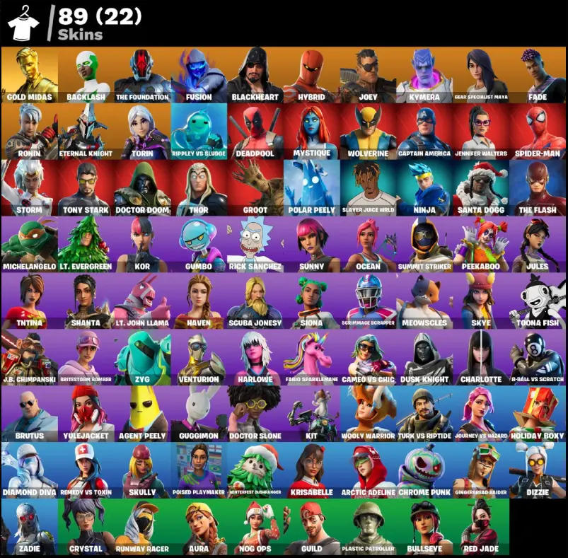 89 skins | Gold Midas | Backlash | The Foundation | Fusion | Blackheart | Hybrid | Joey | Kymera | Gear Specialist Maya | Fade | Ronin | 100 VB