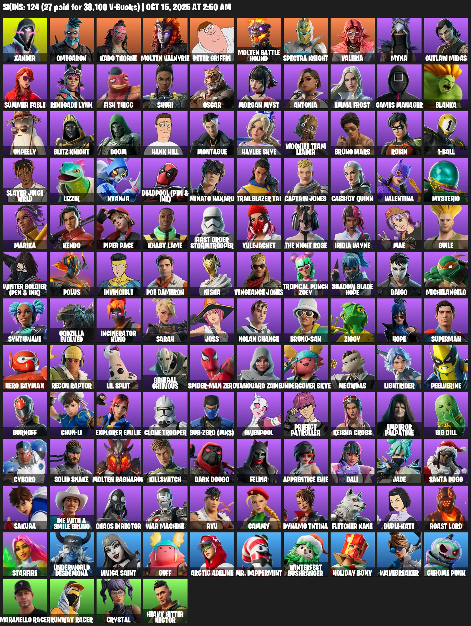 🍨 [PC/PSN/XBOX] 🌟 124 skins | Xander , OmegaKnight , Kado Thorne , Molten Valkyrie , Peter Griffin , Molten Battle Hound , Spectra Knight , Valeria , Nyna | 💙 50 VBUCKS | ✉️ Changeable Email Now