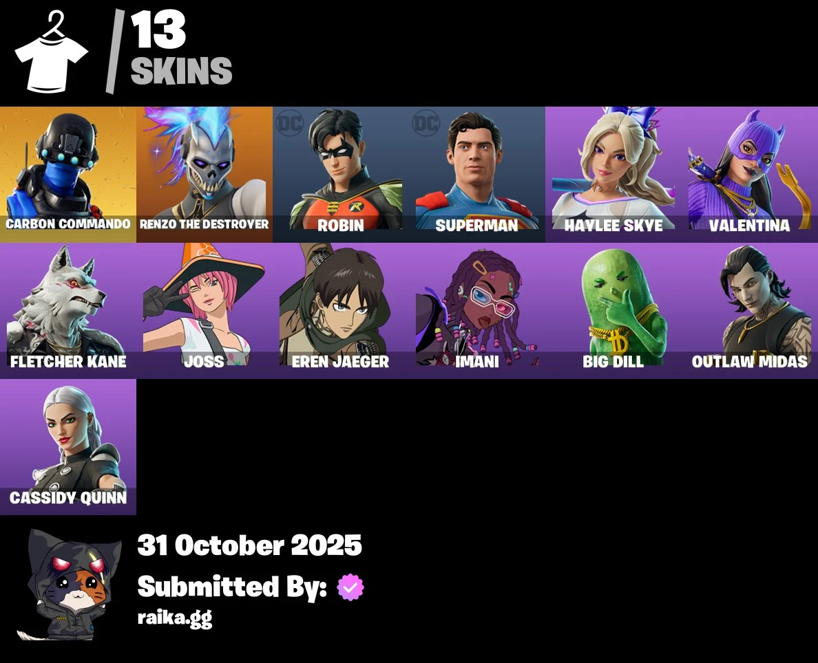 [PC/PSN/XBOX] 13 skins | Carbon Commando | Renzo the Destroyer | Robin | Superman | Haylee Skye | Valentina | Fletcher Kane | Joss | Eren Jaeger | Imani | 350 VB