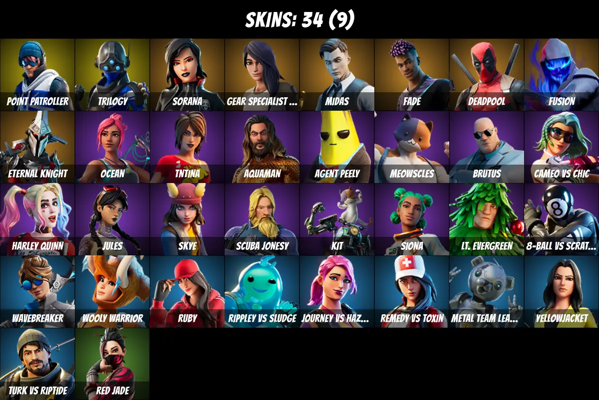 ⚡PC/PSN/XBOX⚡ 34 skins 💎 Deadpool 💎 Harley Quinn 💎 Midas 💎 Jules 💎 Agent Peely 💎 Meowscles 💎 TNTina 💎 Brutus 💎 Skye 💎 Point Patroller 💎 Gear Specialist Maya 💎 Eternal Knight 💎 Sorana 💎 Fusion 💎 Trilogy 💎 Fade 💎 Ol' Woody 💎 Ocean 💎 Aquaman 💎 150 V-Bucks 💎
