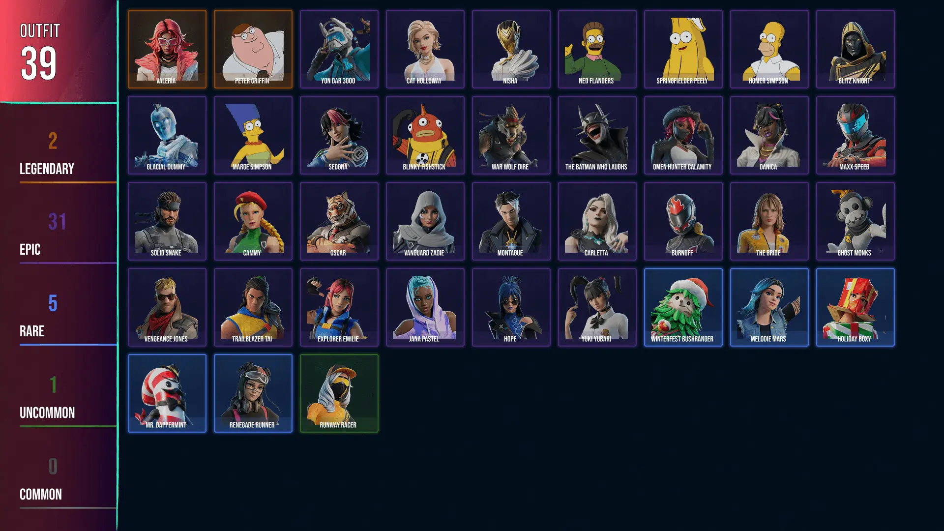 🥑 PC/PSN/XBOX 🥑 39 SKINS 🥑 Valeria 🥑 Peter Griffin 🥑 GHOST Monks 🥑 Maxx Speed 🥑 Solid Snake 🥑 Oscar 🥑 Danica 🥑 Yon Dar 3000 🥑 Nisha 🥑 Ned Flanders 🥑 Springfielder Peely 🥑 Montague 🥑 50 VBUCKS 🥑 FYxJf 🥑