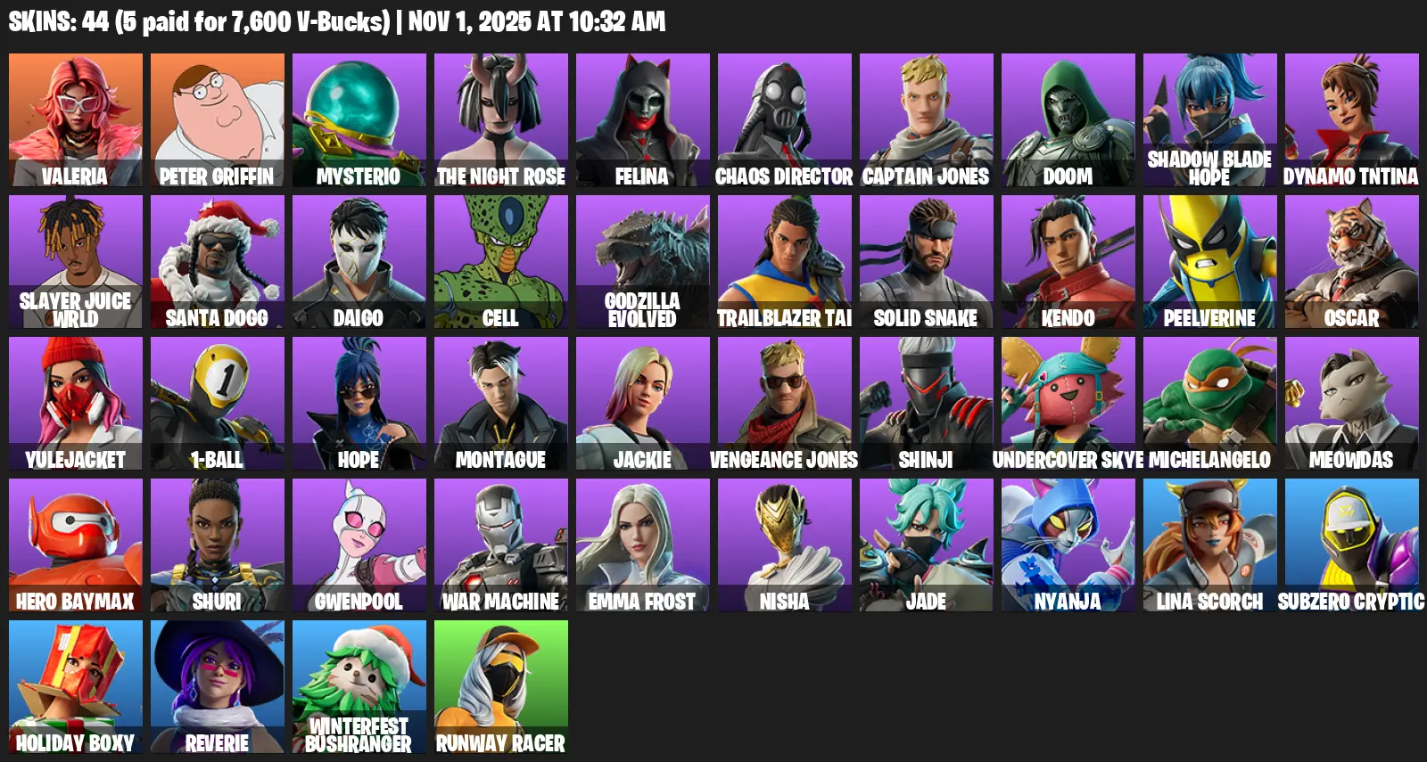 🍨 [PC/PSN/XBOX] 🌟 44 skins | Valeria , Mysterio , The Night Rose , Felina , Chaos Director , Captain Jones , Doom , Shadow Blade Hope , Dynamo TNTina | 💙 100 VBUCKS | ✉️ Changeable Email Now