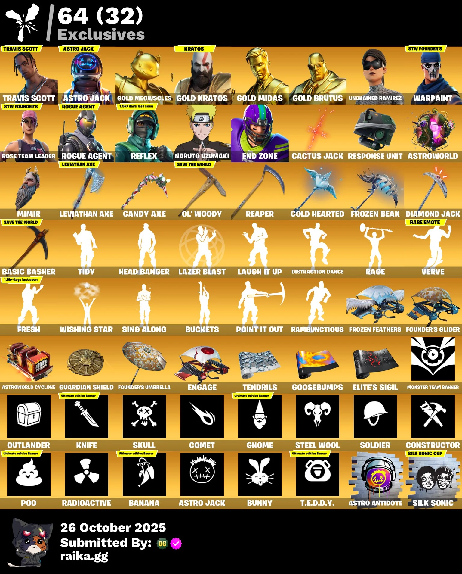 [PC/PSN/XBOX] 458 skins | OG STW( Ultimate Edition ) | Travis Scott | Astro Jack | Gold Meowscles | Gold Kratos | Gold Midas | Gold Brutus | Unchained Ramirez | Rogue Agent | Reflex | 50 VB