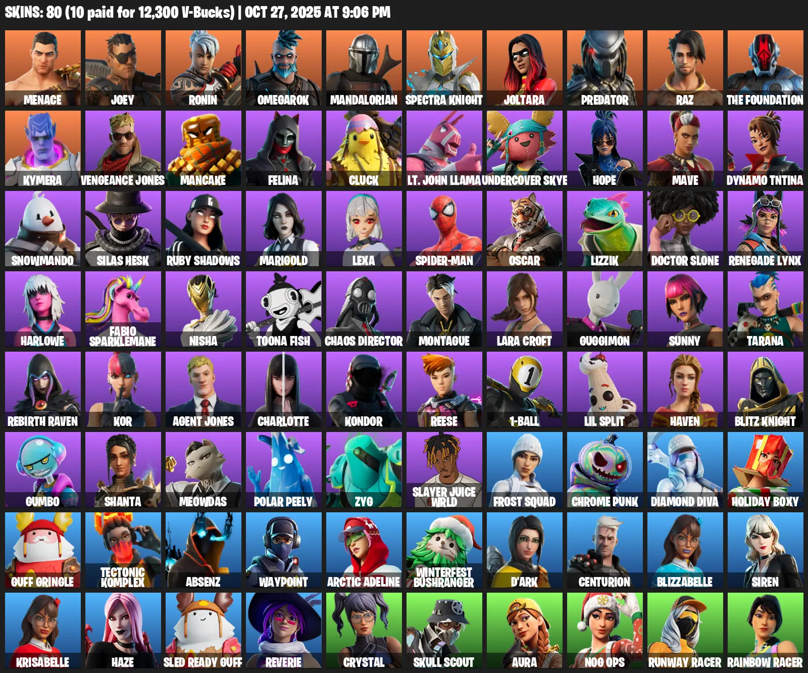 [PC/PSN/XBOX] | 80 skins | 650 V-bucks | Lara Croft | Menace | Joey | Ronin | Omegarok | Mandalorian | Spectra Knight | Joltara | #HGP5400 | #MBFN
