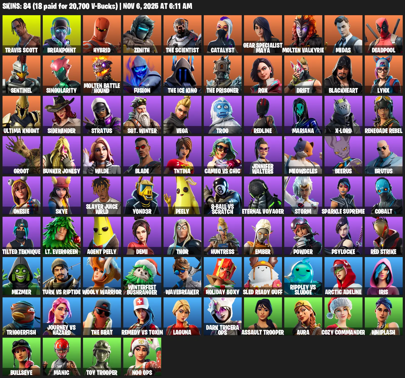 [PC/PSN/XBOX] | 84 skins | Travis Scott | Breakpoint | Hybrid | Zenith | The Scientist | Catalyst | Gear Specialist Maya | Molten Valkyrie | S4G