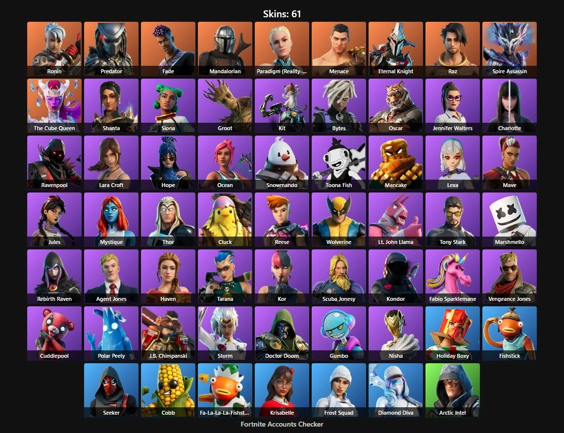 PC/XBOX/PSN 61 Skins⚡ | Lara Croft | Ronin | Predator | Fade | Mandalorian | Paradigm (Reality-659) | Menace | Eternal Knight | Raz | Spire Assassin