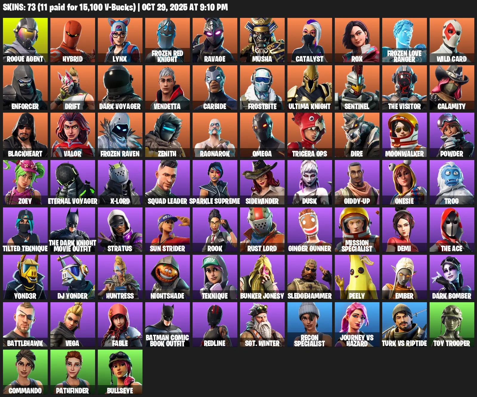 [PC/XBOX/PSN] 73 Skins | Rogue Agent | Hybrid | Lynx | Frozen Red Knight | Ravage | Musha | Catalyst | Rox | Frozen Love Ranger | Wild Card | Enforcer | Drift | Dark Voyager | Vendetta | Carbide | Frostbite | Ultima Knight | Sentinel | The Visitor
