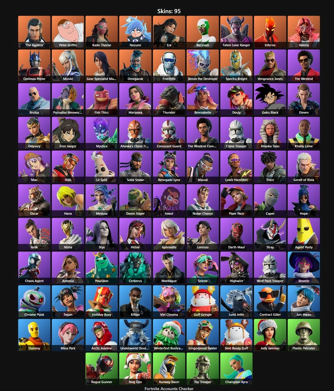 PC/XBOX/PSN 95 Skins⚡ | The Ageless | Peter Griffin | Kado Thorne | Nezumi | Era | Backlash | Fallen Love Ranger | Inferno | Valeria | Optimus Prime | Mizuki