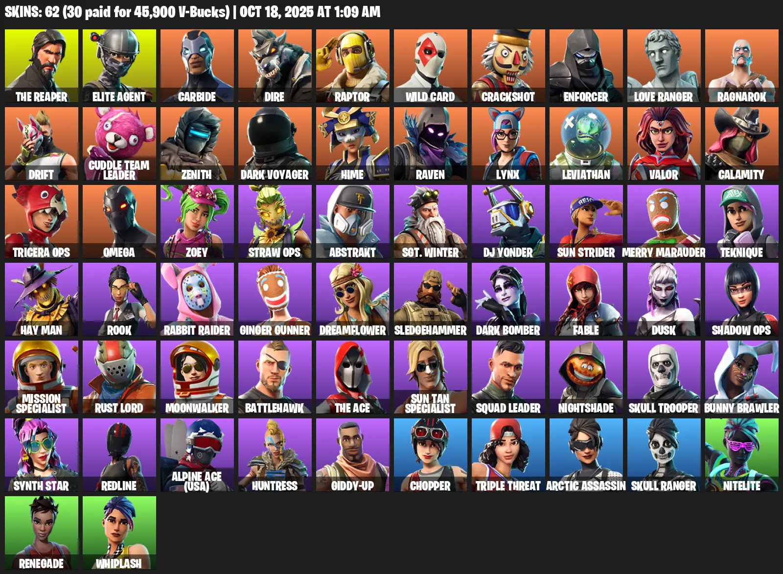 [PSN/XBOX/PC] 62 Skins | The Reaper | Elite Agent | Carbide | Dire | Raptor | Wild Card | Crackshot | Enforcer | Love Ranger | Ragnarok | Drift | Cuddle Team Leader | Zenith | Dark Voyager | Hime | Raven | Lynx | Leviathan | Valor | Calamity | Tricera Ops