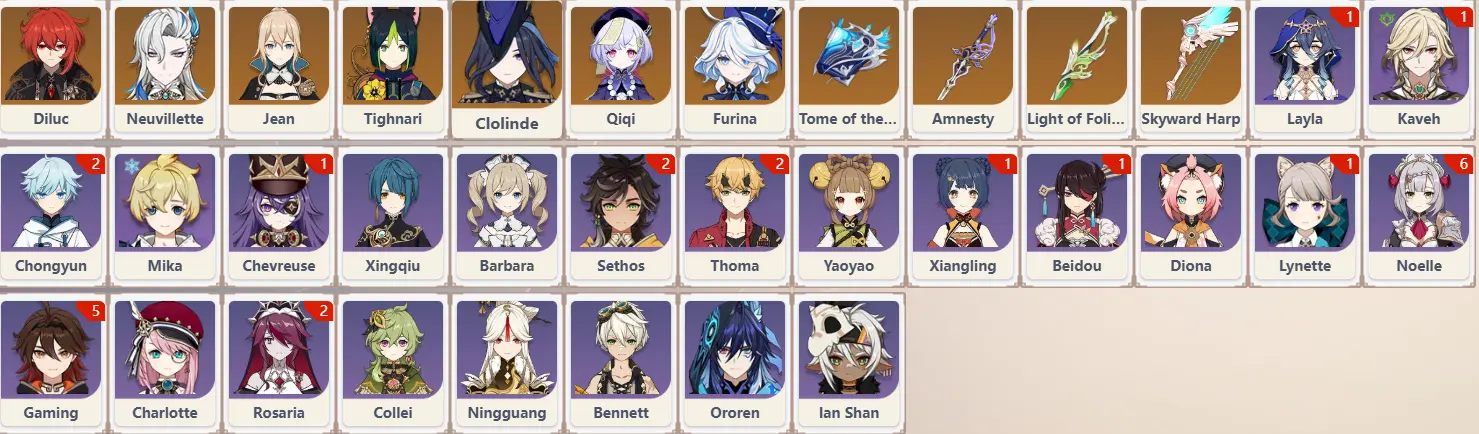[EU]AR51|FiveStars*7||Furina+[Neuvillette+arms]+[Clolinde+arms]+Diluc+Jean+Tighnari+Qiqi+Five Star Weapons*4||Four stars*10-25|For detailsplease see the description and picture
