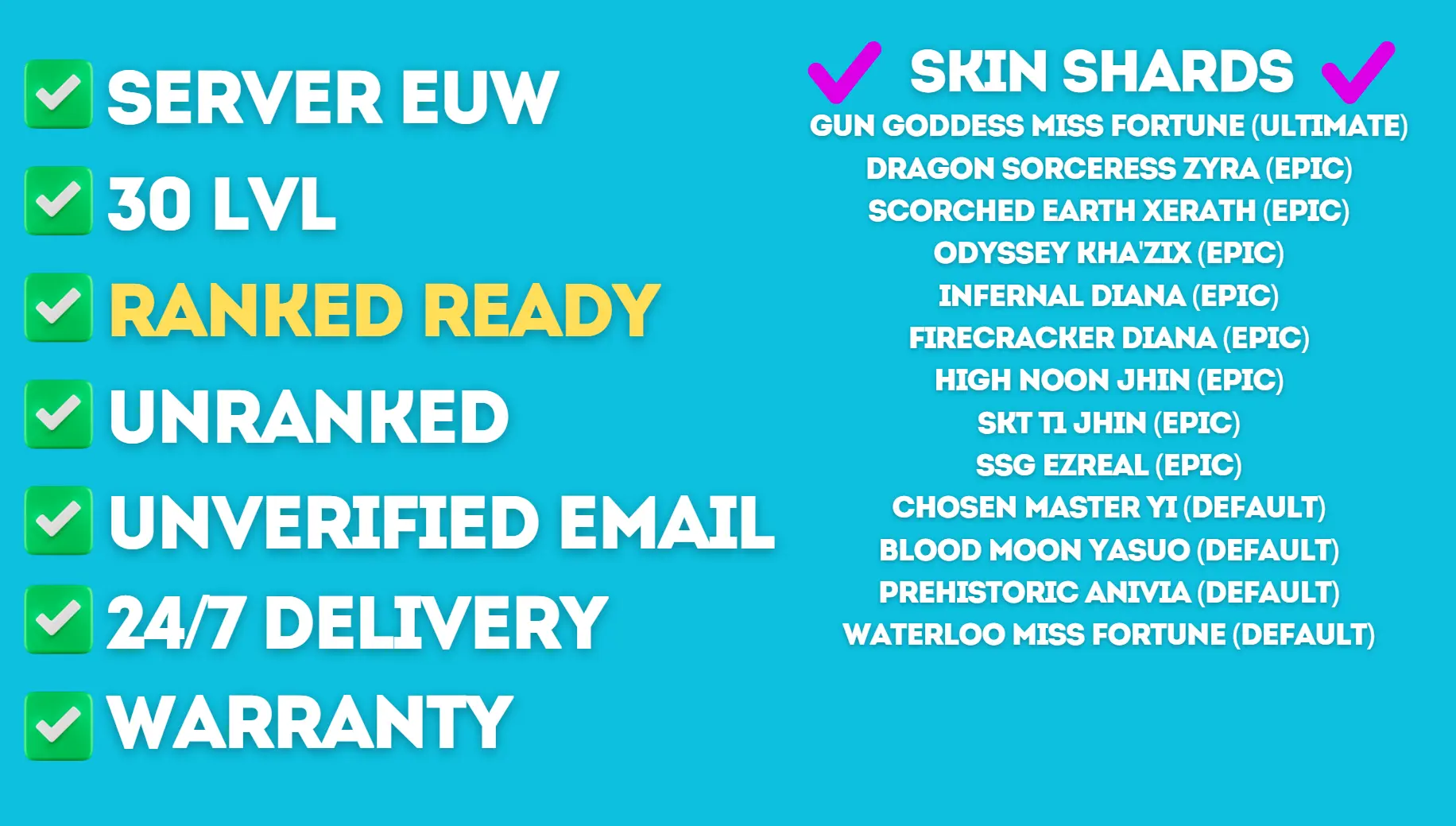 EUW 30 LvL ✅ Ranked Ready ✅ BE: 56205 ✅ Unverified ✅ Unranked ✅ Shards: Gun Goddess Miss Fortune, Dragon Sorceress Zyra, Scorched Earth Xerath, Odyssey Kha'Zix, Infernal Diana, Firecracker Diana, High Noon Jhin, SKT T1 Jhin, SSG Ezreal, Chosen Master Yi