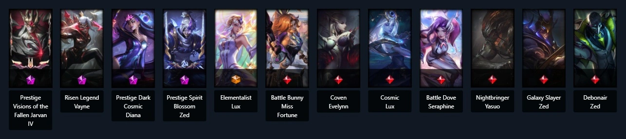 UnRanked┃28 skins┃44 Champs┃(4 Mythic) Risen Legend Vayne Prestige Spirit Blossom Zed Prestige Dark Cosmic Diana Prestige Visions of the Fallen Jarvan IV Debonair Zed Galaxy Slayer Zed Battle Bunny Miss Fortune