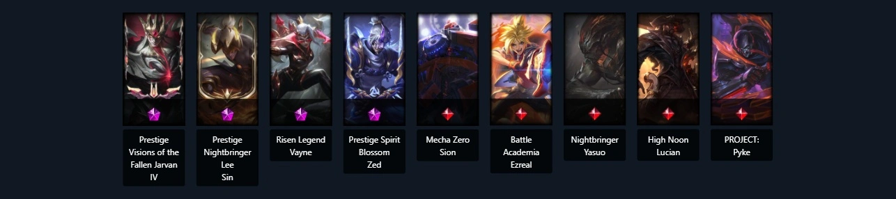 UnRanked┃39 skins┃120 Champs┃(4 Mythic) Risen Legend Vayne Prestige Spirit Blossom Zed Prestige Nightbringer Lee Sin Prestige Visions of the Fallen Jarvan IV Nightbringer Yasuo Mecha Zero Sion PROJECT: Pyke