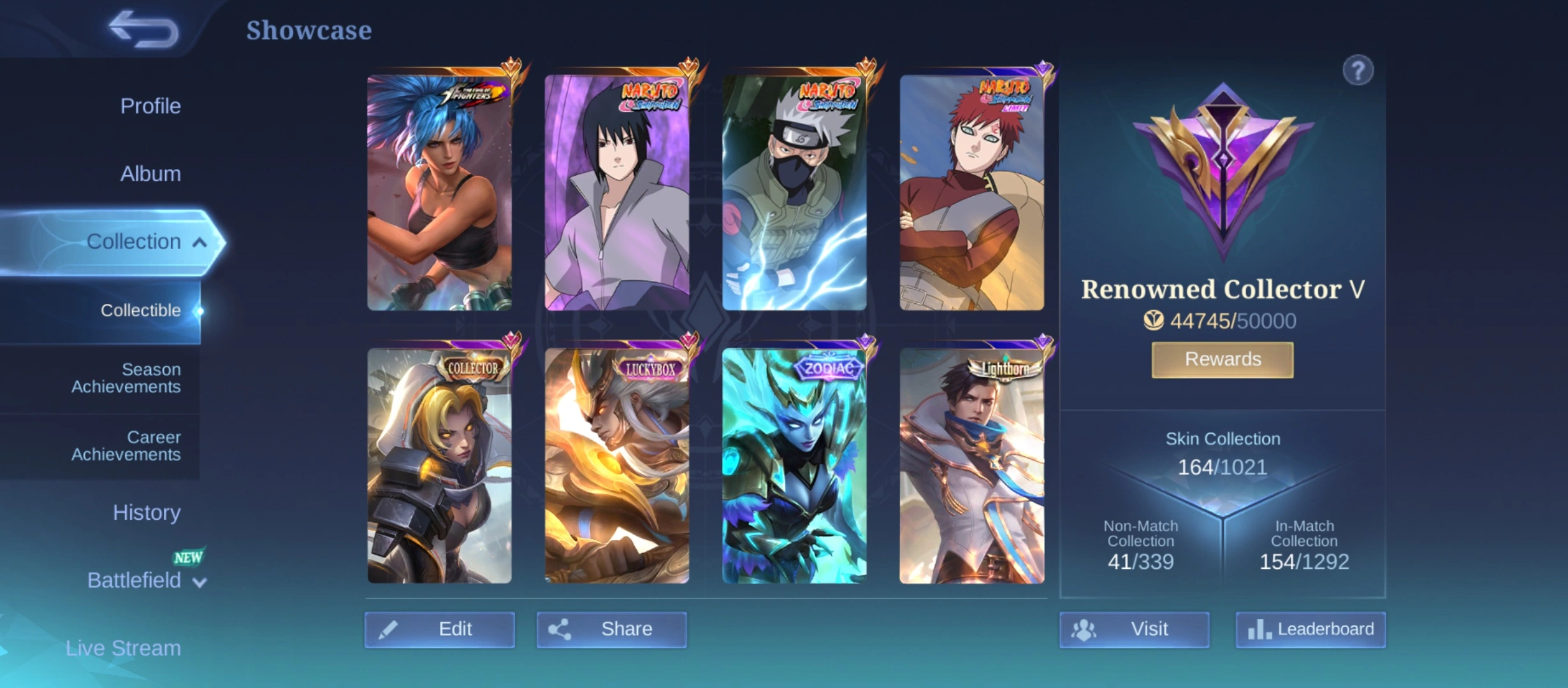 GG886|Lvl 55|RENOWNED CC 5|5 EMBLEM MAX|164 SKIN|3 NARUTO SKIN|SASUKE SUYOU|KAKASHI HAYABUSA|MARTIS LUCKYBOX|9 EPIC SKIN|SELENA ZODIAC