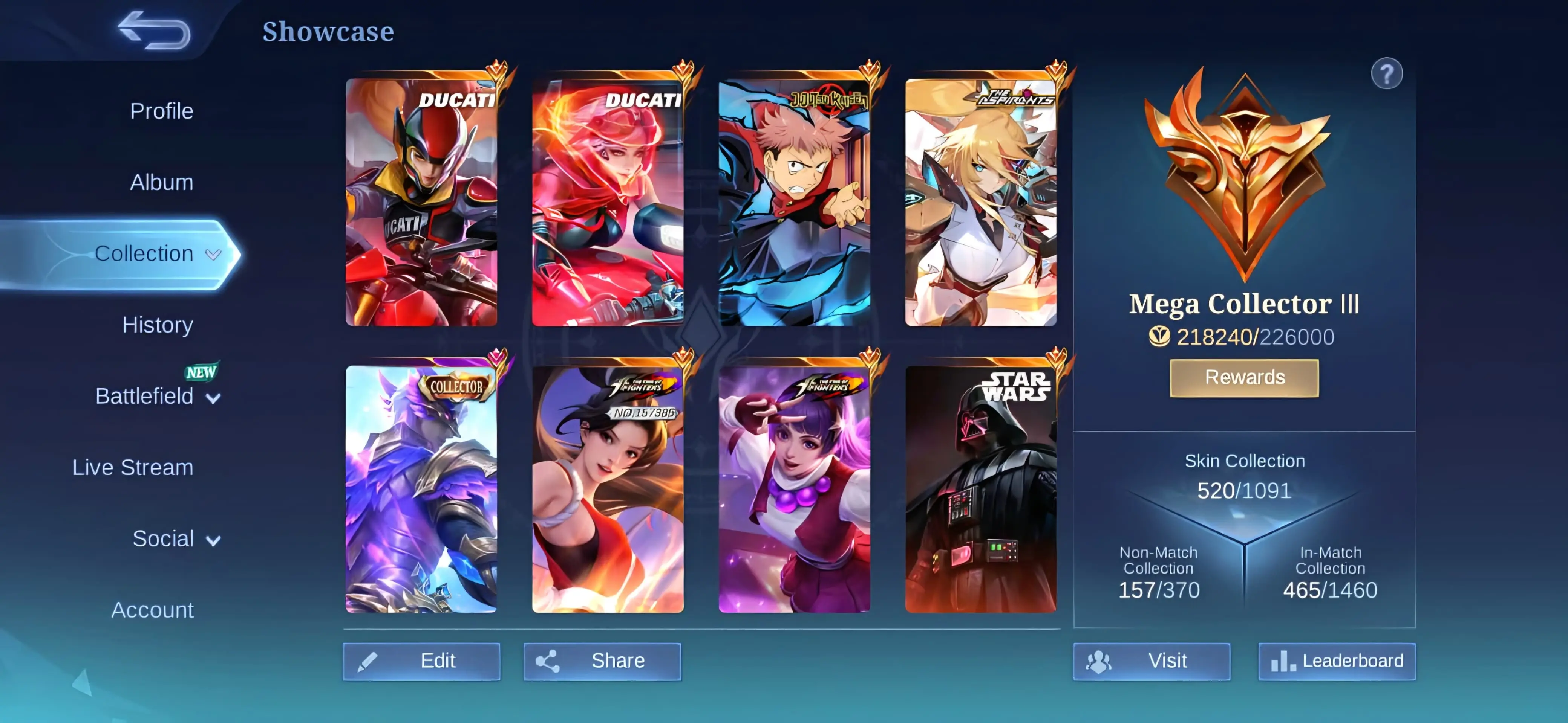 [IOS/ANDROID] CEL LVL 133 | 132 HEROES | 520 SKINS | MEGA 3 | HEAVY COLLAB | 2 LEGEND SABER JOHNSON ⸱ 5 RARE COLLECTOR AAMON DYRROTH ⸱ JJK ⸱ KOF ⸱ STARWARS ⸱ SOUL VESSEL ⸱ ASPIRANT