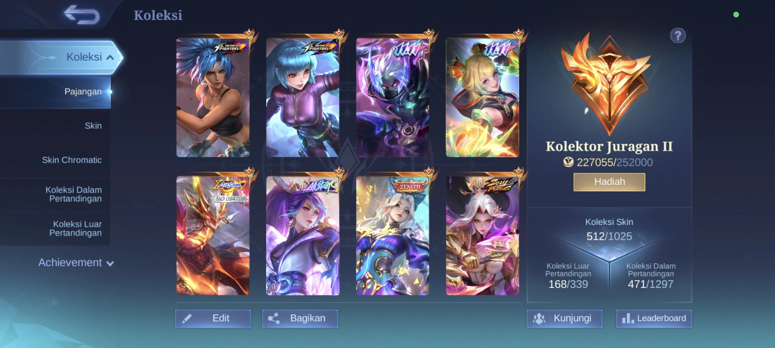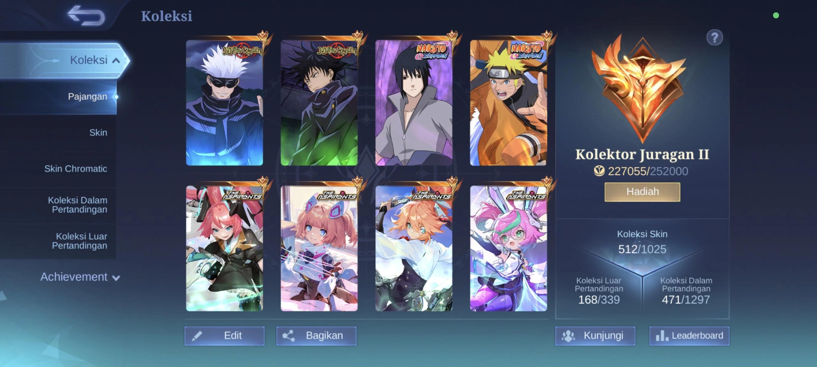 MM302|Lv114|512Skin|MEGACOLLECTORII|HighWR|3LEGEND|2KOF|4ASPIRANTS|ZENITH Selena|2JJK|2NARUTO|ALLSTAR Moskov|2-11.11|SOULVESSELS Hanabi|3COLLECTOR