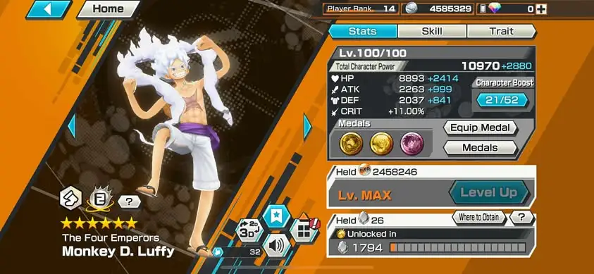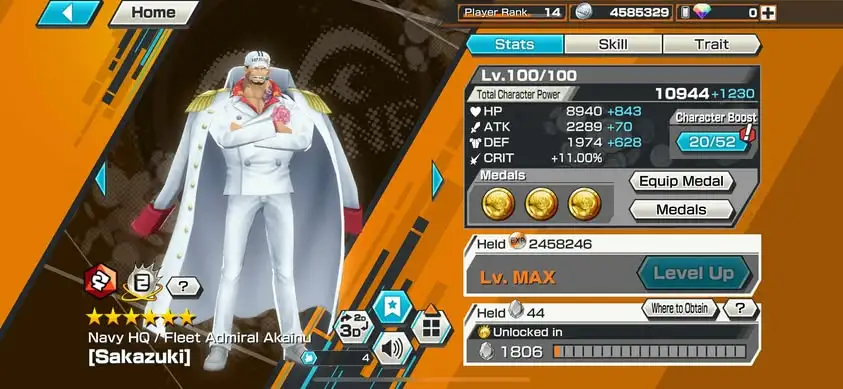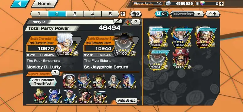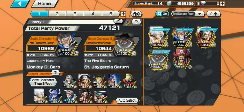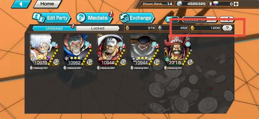 [3364][IOS+ANDROID] 5 EX META MAX / Luffy Light + Saturn + Garp + Akainu + Roger / 1206 gold stones, Solo Fresh, Support 136%, Good Medal