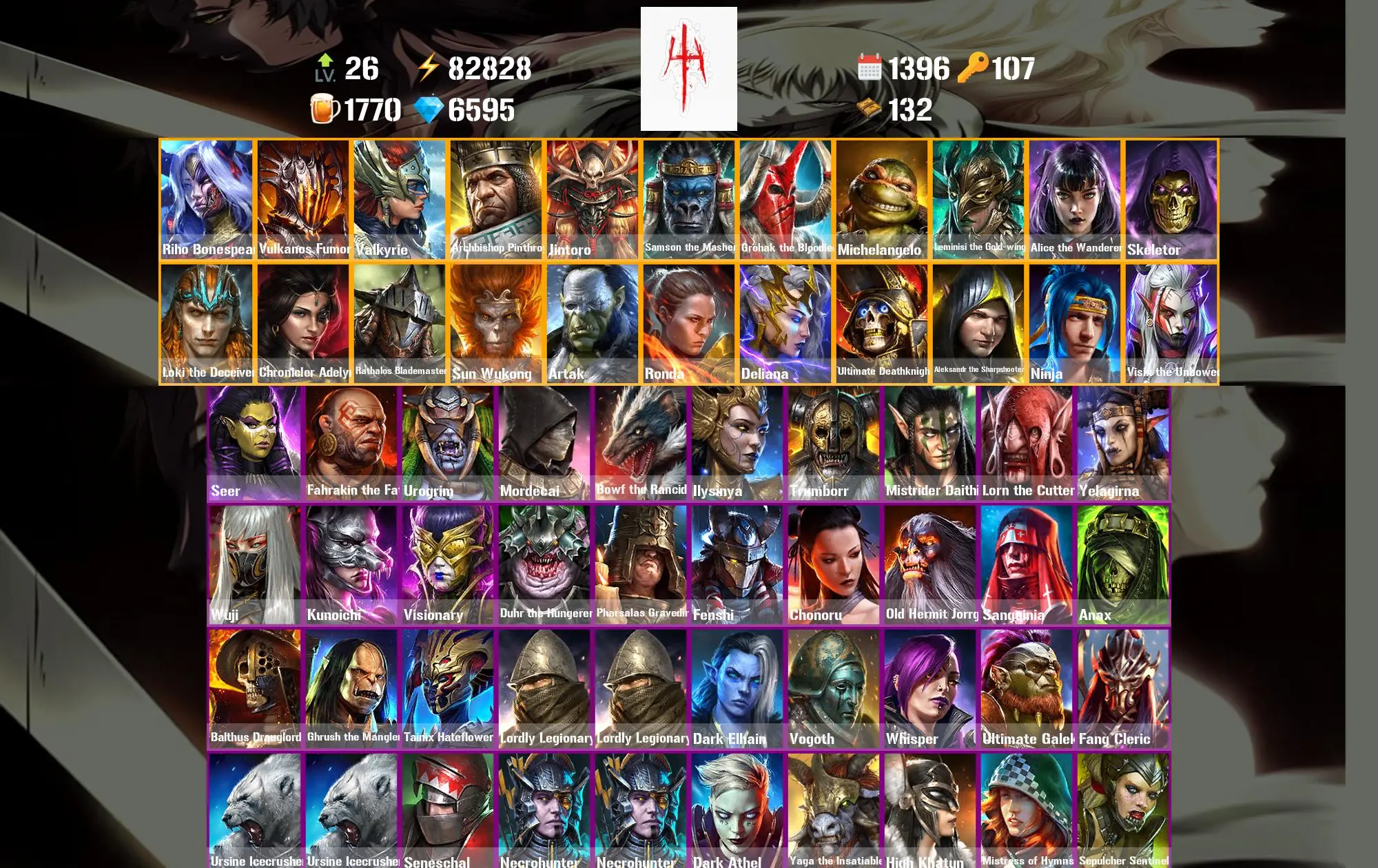 1396 Days 82.8k Energy Riho Bonespear ⸱ Vulkanos Fumor ⸱ Valkyrie ⸱ Archbishop Pinthroy ⸱ Jintoro ⸱ Seer ⸱ Fahrakin the Fat ⸱ 53.3m Silver ⸱ 6.6k Gems