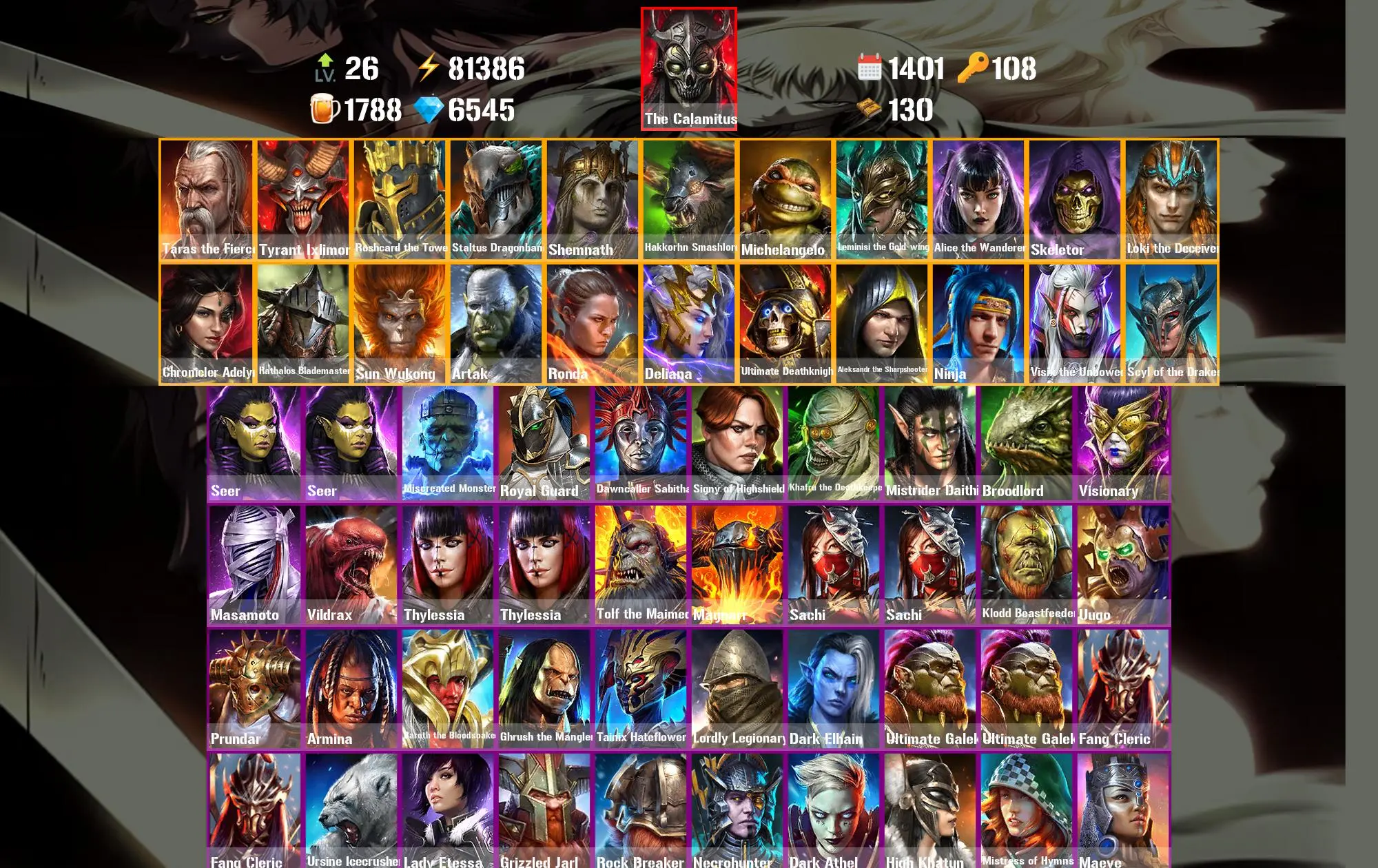 1401 Days 81.4k Energy [Mythical Starter] The Calamitus ⸱ Taras the Fierce ⸱ Tyrant Ixlimor ⸱ Roshcard the Tower ⸱ Staltus Dragonbane ⸱ Shemnath ⸱ Seer ⸱ Seer ⸱ 56.2m Silver ⸱ 6.5k Gems