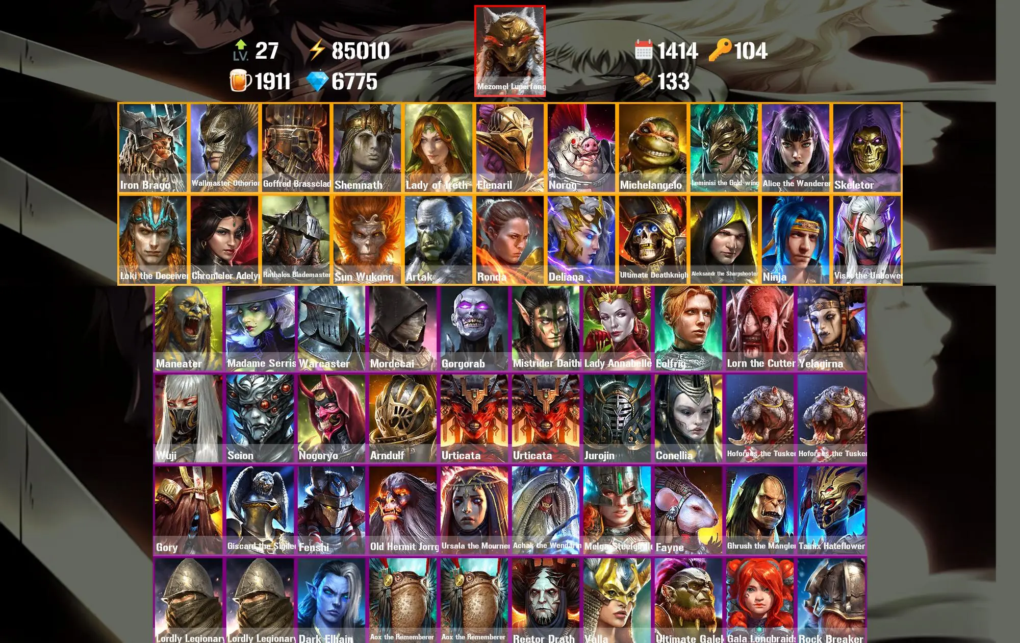 1414 Days 85.0k Energy [Mythical Starter] Mezomel Luperfang ⸱ Iron Brago ⸱ Wallmaster Othorion ⸱ Goffred Brassclad ⸱ Shemnath ⸱ Lady of Ireth ⸱ Maneater ⸱ Madame Serris ⸱ 51.9m Silver ⸱ 6.8k Gems