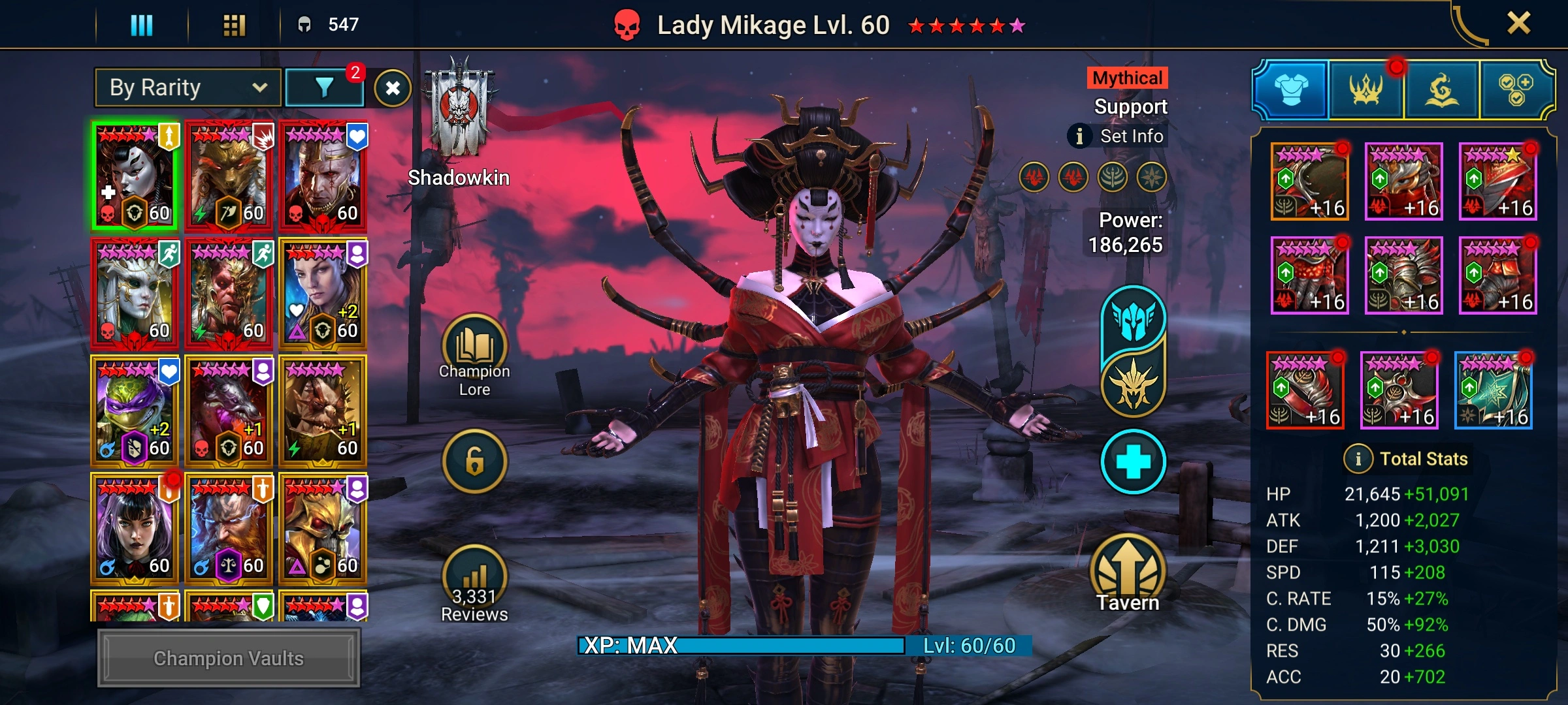 [5 Mythical Champions][17.79M] Lady Mikage(5*),Arbais,Mezomel,Embrys,Karnage + 162 LEGENDARY (Acrizia+Gnut x3,Titus,Arb 402,Nekhret(5*),Krisk,Lamasu,Niamhe,Tormin,Lydia+2,Mich(5*)+Raph(5*)+Donnie+2,Armanz(5*),Harima...) + 1k UNM + 25 SD/25 SHOGUN AUTO