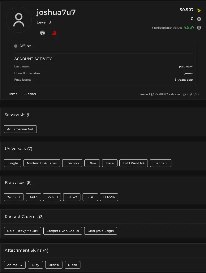 ⭐[XBOX LINKABLE]⭐Level 181🎨7 Universals Skin🌸1 Seasonals Skin❄️6 Black Ice👑67 Operators🔥116 Weapon Skin💫50K Renown