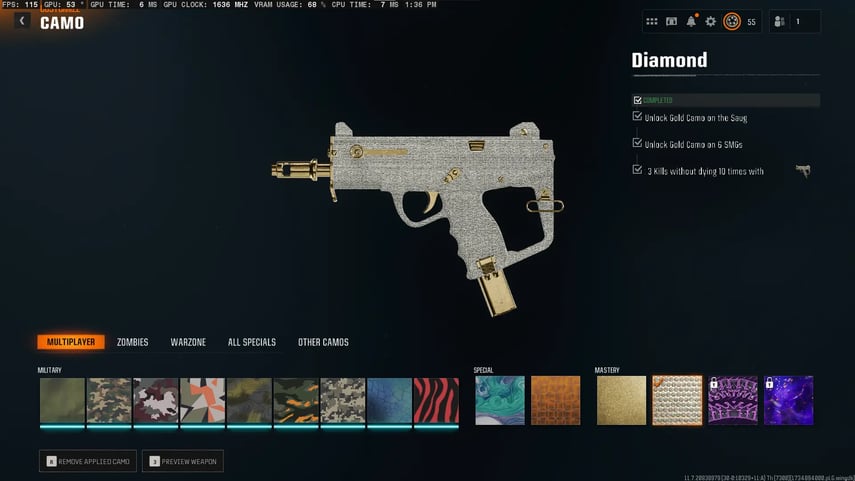 💎 ⦿ 13 Diamond Camos ⦿ Game Pass Activated ⦿ BO6 / Warzone ⦿ Level 55 ⦿ 13 Gold Camos ⦿ 170 Total Camos ⦿ Ready To Enter Prestige ⦿ 16 Operators ⦿ Linkable To Any Platform 💎