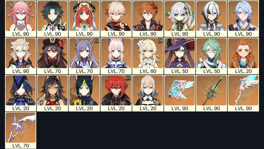 💙[Europe] AR 56 💙 21x Five Stars 💙 50 Chars 💙 Arlecchino C1 & Ayaka & Hu Tao & Keqing C2 & Wanderer & Mona & Nahida & Yelan & Tighnari C1 & Diluc & Dehya & Xianyun & Qiqi 💙