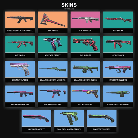 AP | 19 skins 🐓 Prelude to Chaos Vandal 🐓 .SYS Melee 🐓 Ion Phantom 🐓 .SYS Bucky 🐓 .SYS Vandal 🐓 Montage Frenzy 🐓 .SYS Sheriff 🐓 .SYS Stinger 🐓 Shimmer Classic 🐓 Coalition: Cobra Marshal 🐓 Coalition: Cobra Judge 🐓 Hue Shift Bulldog 🐓 J8025