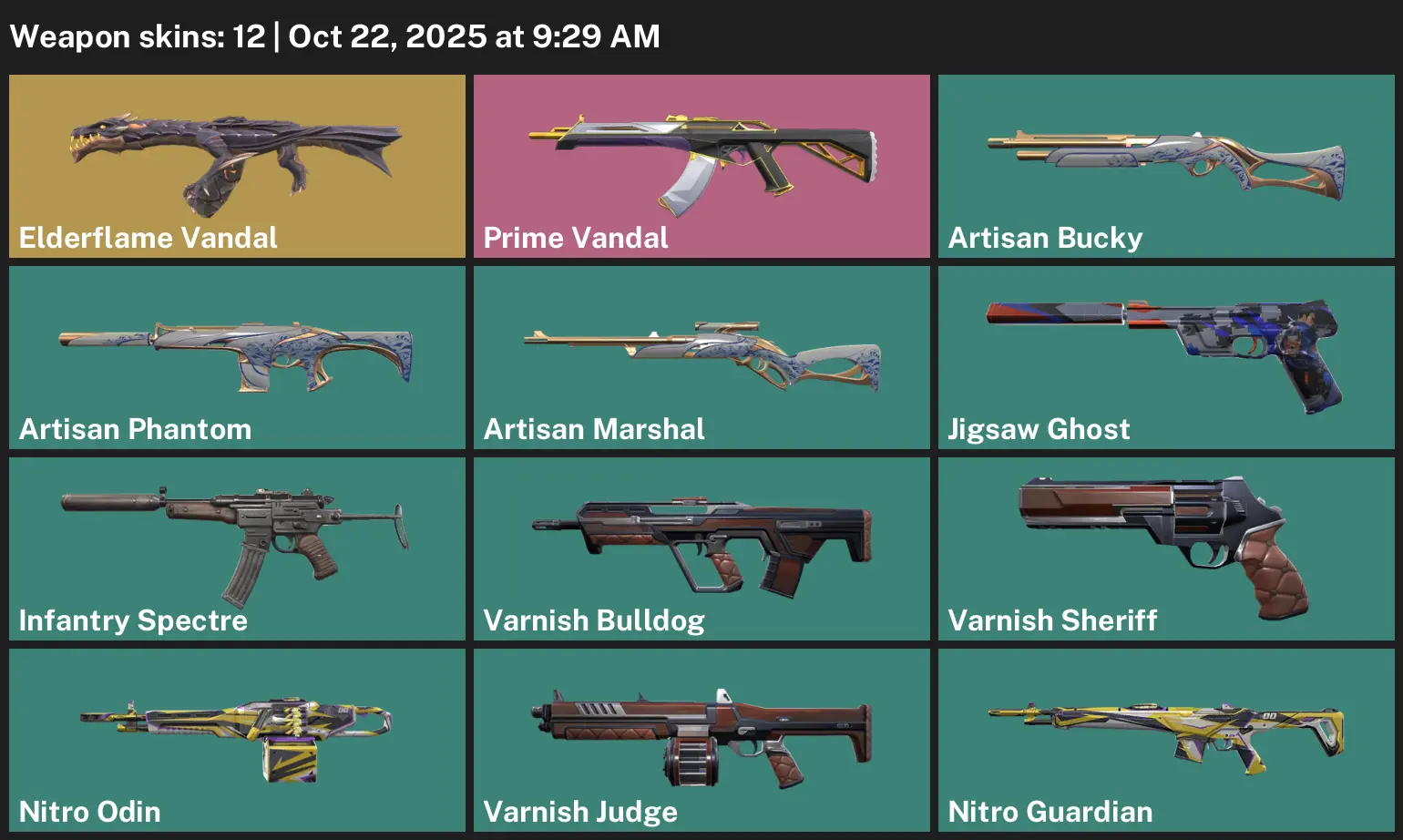 🌊 AP ⚓️ Unranked ⛲️ 12 Skins 🤘 91 VP 🧩 14 Agents 🌍 Value: 5125 VP 🦉 Elderflame Vandal 🪦 Prime Vandal 🍗 Artisan Bucky 🗳 Artisan Phantom 😼 Artisan Marshal 🩼 Jigsaw Ghost