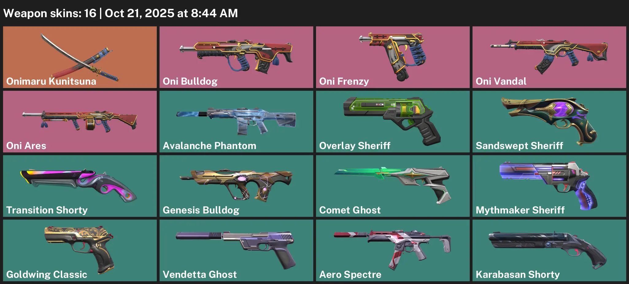 🍠 AP 🐁 Unranked 🗿 16 Skins 🚑 231 VP 🤬 20 Agents 🏡 Value: 13725 VP 🎬 Onimaru Kunitsuna 🎎 Oni Bulldog 💽 Oni Frenzy 🙊 Oni Vandal 🚚 Oni Ares ⌨️ Avalanche Phantom