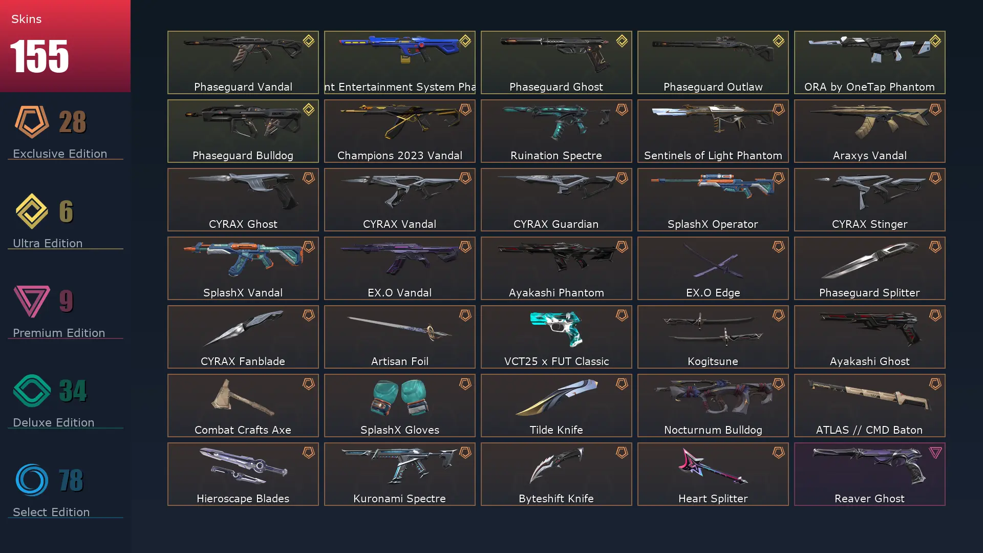 EU 🍏 155 Skins ⚽️ Ascendant 2 😯 29 Agents ⚾️ 266 Level 📊 Champions 2023 Vandal 🍯 CYRAX Vandal 🌶 Combat Crafts Judge 📑 Valiant Hero Ghost 🫳 Combat Crafts Phantom 🏸 CYRAX Fanblade 🐋 SplashX Gloves 🦄 Phaseguard Vandal 📜 Artisan Bucky