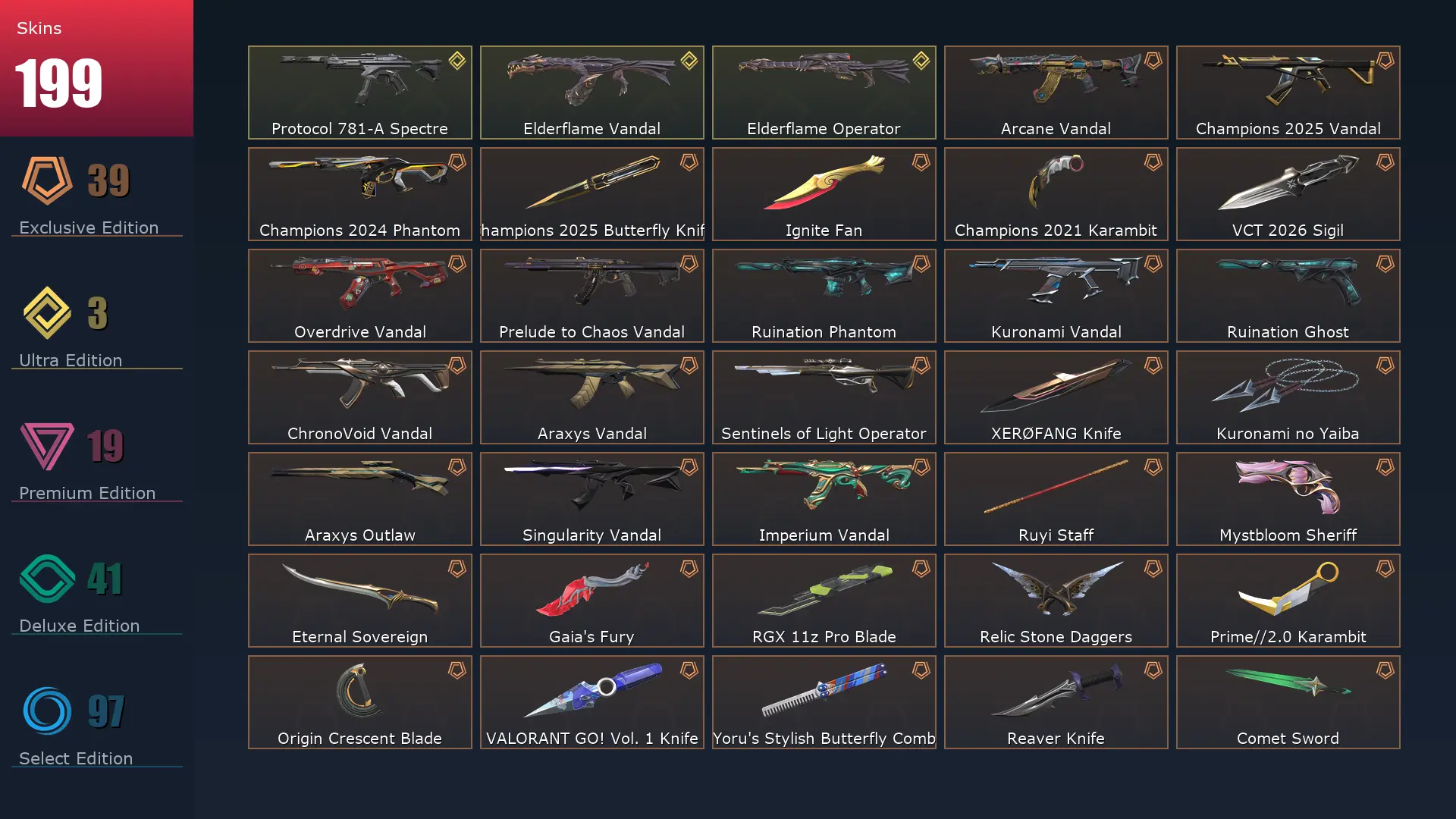 EU 🧋 199 Skins 🦡 Diamond 2 🍲 28 Agents 💣 415 Level 🔥 Arcane Vandal 🤼 Champions 2025 Vandal 🗃 Champions 2024 Phantom 🔫 Champions 2025 Butterfly Knife 📱 Ignite Fan 🌳 Champions 2021 Karambit 🏷 Gaia's Fury 🐥 Forsaken Vandal
