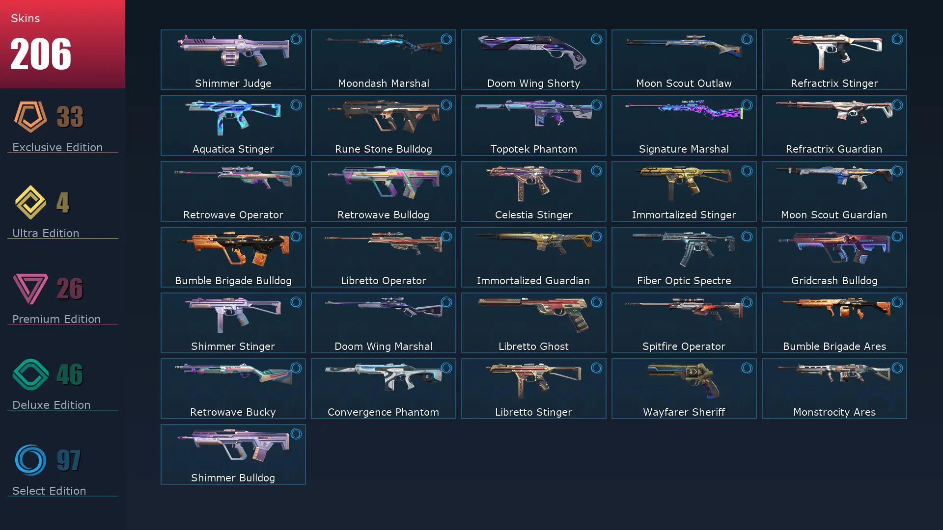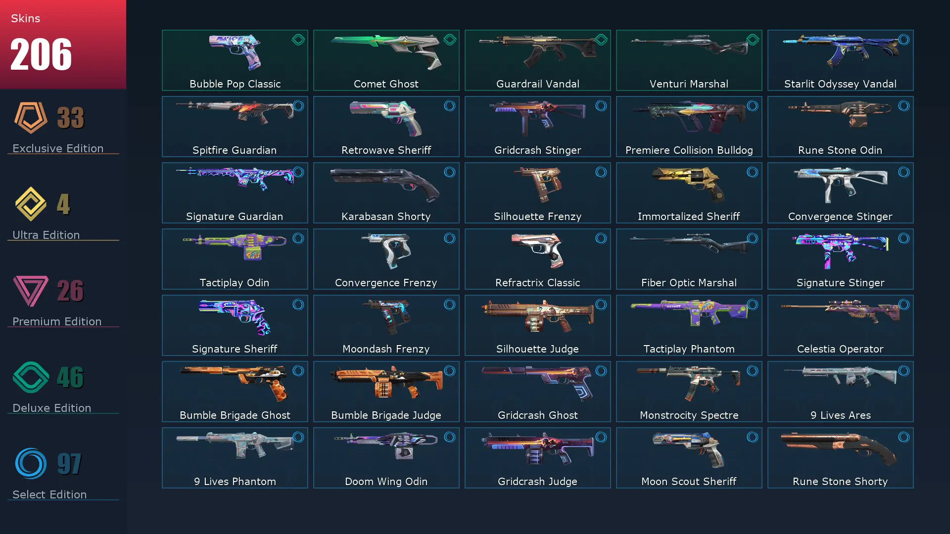 EU 💵 206 Skins 🐹 26 Agents 🎸 232 Level 🪠 Champions 2024 Phantom 📫 Champions 2024 Blade 🎃 RGX 11z Pro Vandal 🐚 Reaver Karambit 🥥 VCT 2025 Karambit 😟 Prime//2.0 Frenzy 🫛 Neo Frontier Odin 🛌 Ion Sheriff 😅 Ion Vandal