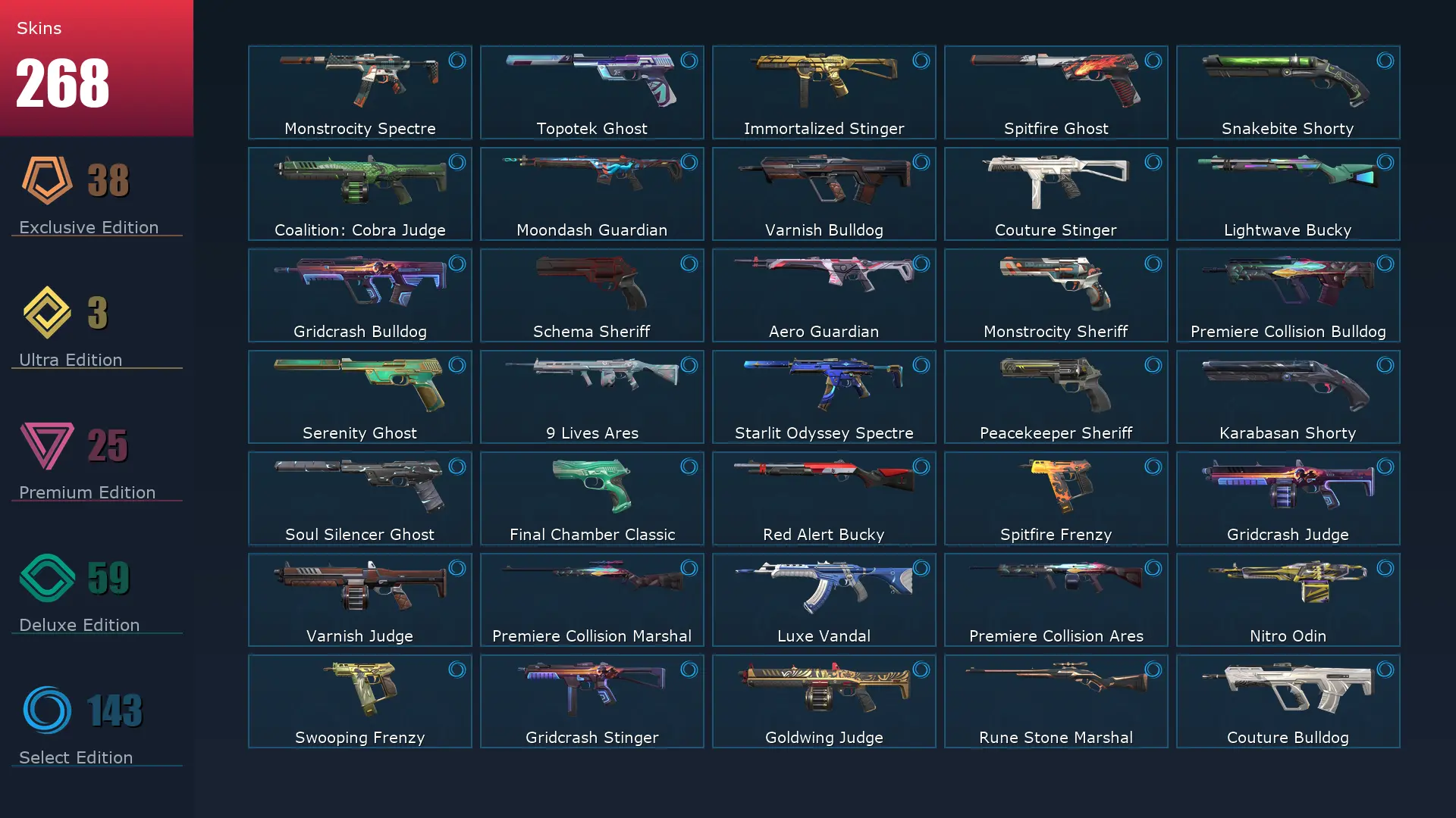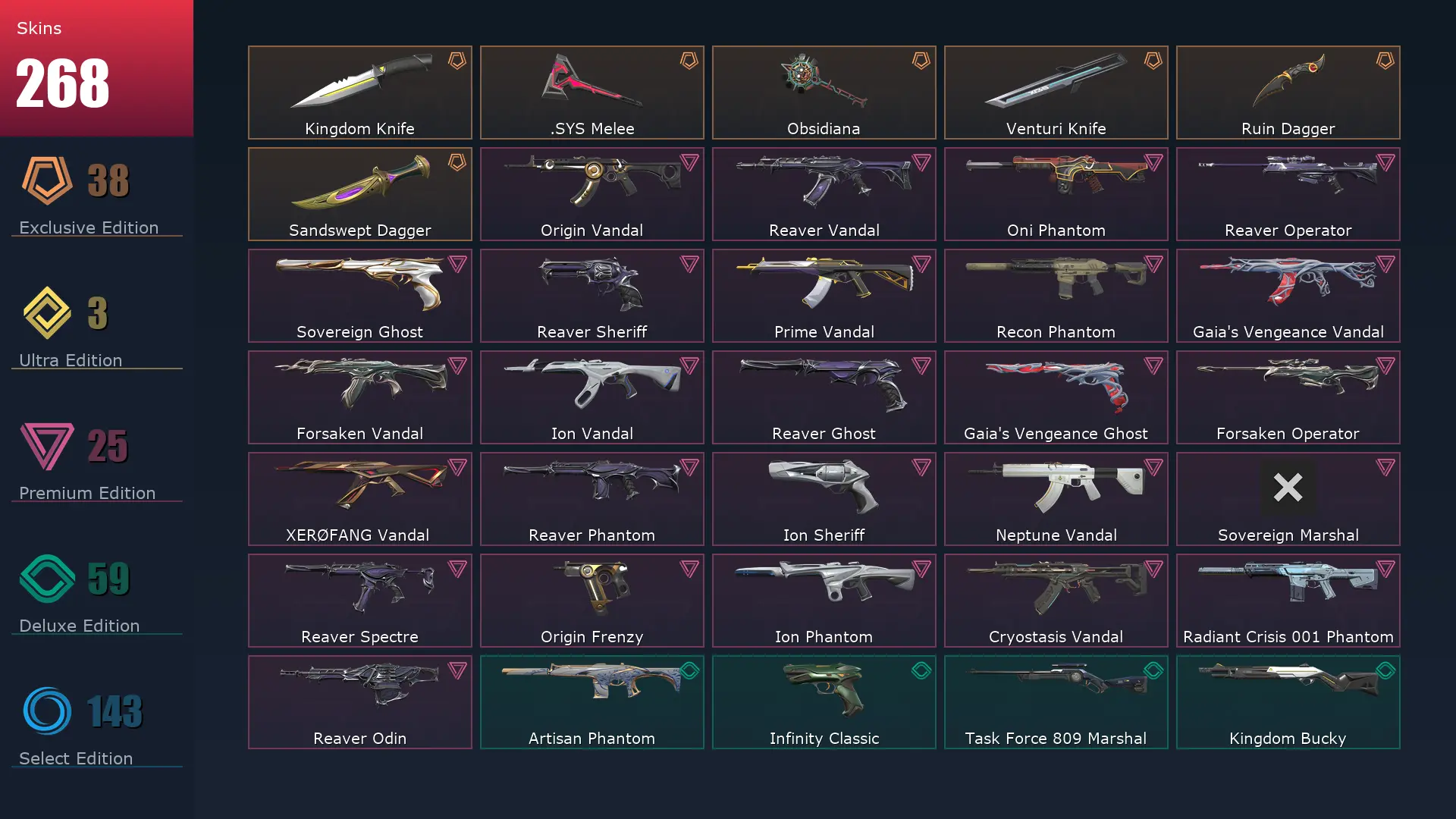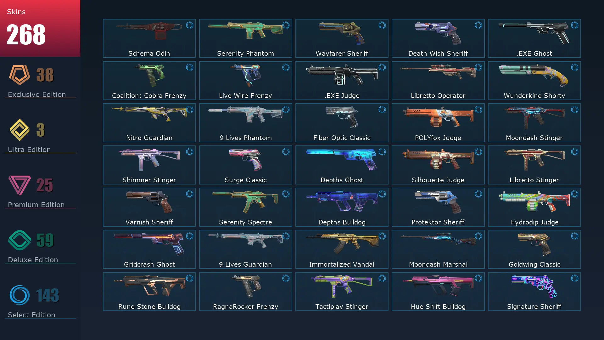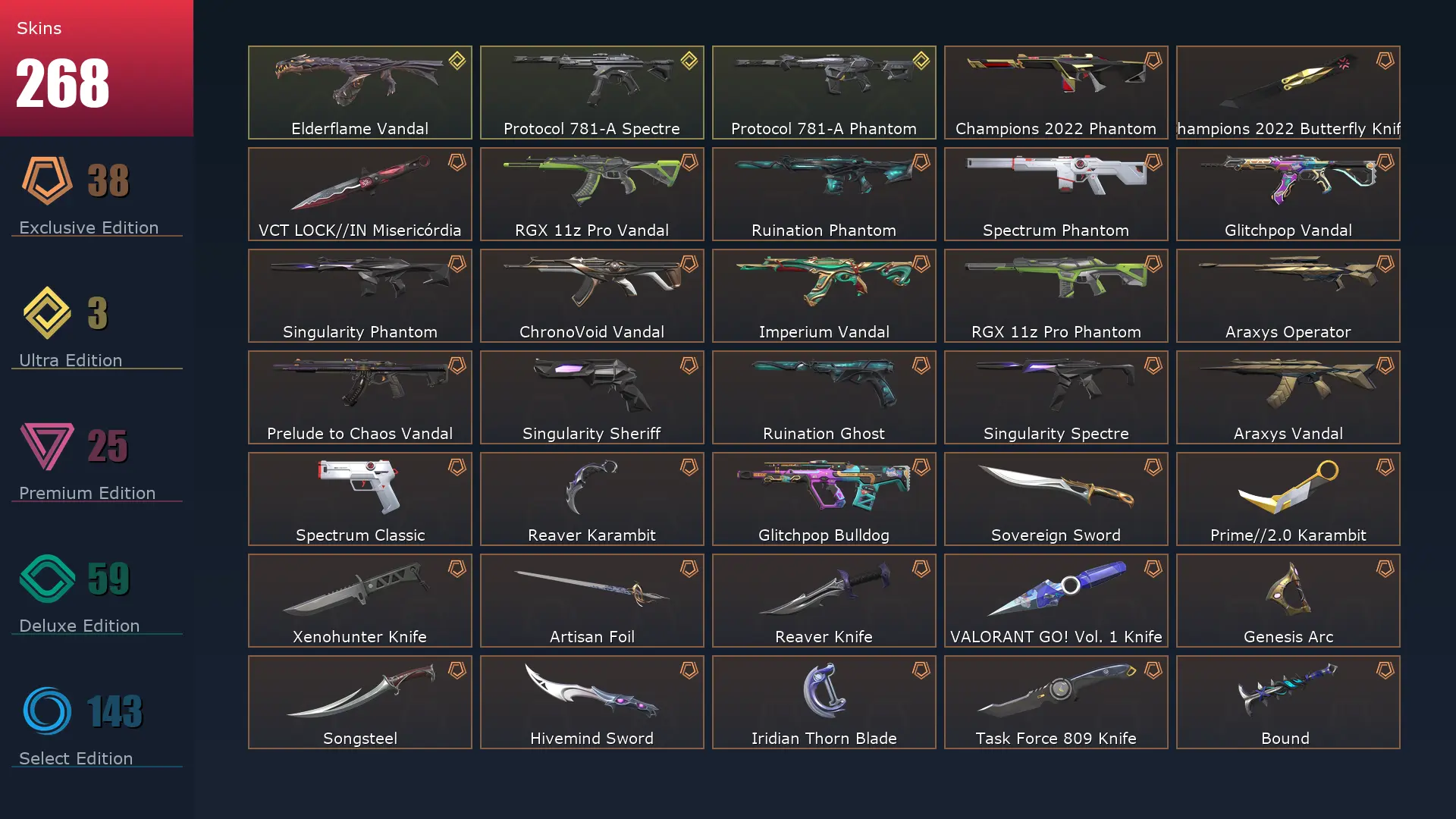 EU 😈 268 Skins 📙 25 Agents 🚪 415 Level 🧨 Champions 2022 Phantom 🚦 Champions 2022 Butterfly Knife 🍊 VCT LOCK//IN Misericórdia 🍥 Hue Shift Spectre ❄️ Forsaken Operator 🌴 Imperium Vandal 💈 Elderflame Vandal 🤼♀️ Glitchpop Bulldog