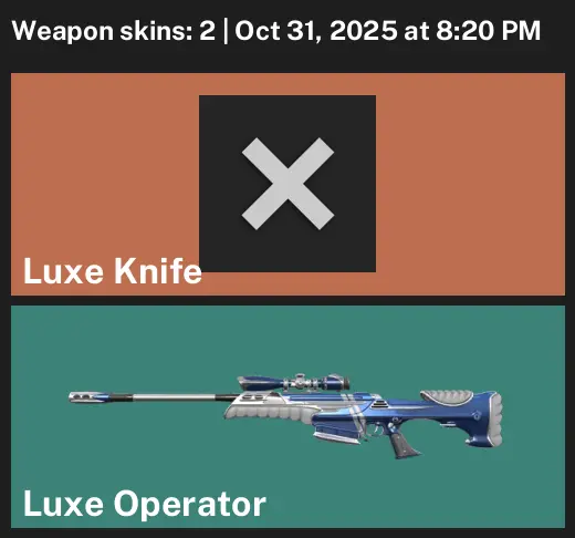 💫 EU 🏷 Unranked 🙄 2 Skins 🧐 80 VP 🧗 2 Agents 🪶 Value: 2625 VP 🎂 Luxe Knife 📉 Luxe Operator