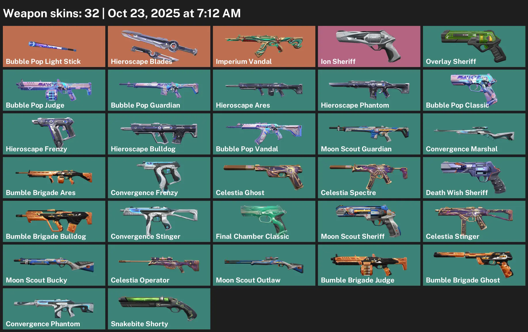 🙃 EU ✉️ Unranked 🫓 32 Skins 🦃 297 VP 🦐 20 Agents 👚 Value: 3950 VP 🗜 Bubble Pop Light Stick 📎 Hieroscape Blades 🏛 Imperium Vandal 🧬 Ion Sheriff 🏌️♀️ Overlay Sheriff 🪜 Bubble Pop Judge