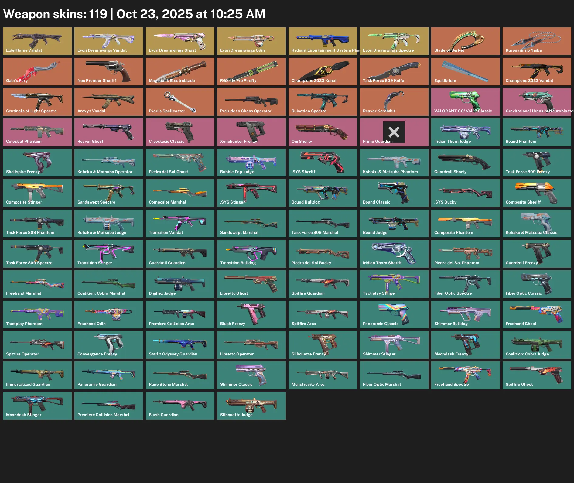 ☃️ NA 🦐 Unranked 🎂 119 Skins 🩸 120 VP 🌃 20 Agents 🏝 Value: 84750 VP 🤪 Elderflame Vandal 🚕 Evori Dreamwings Vandal 💣 Evori Dreamwings Ghost 🥽 Evori Dreamwings Odin 🪘 Radiant Entertainment System Phantom 🥂 Evori Dreamwings Spectre