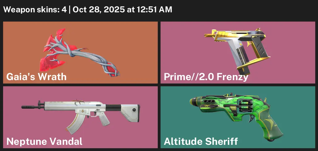 📟 NA 🚛 Unranked 😞 4 Skins 🎍 144 VP 🗼 23 Agents 🍽 Value: 8375 VP 🧘♀️ Gaia's Wrath 🛺 Prime//2.0 Frenzy 🎩 Neptune Vandal 🫳 Altitude Sheriff
